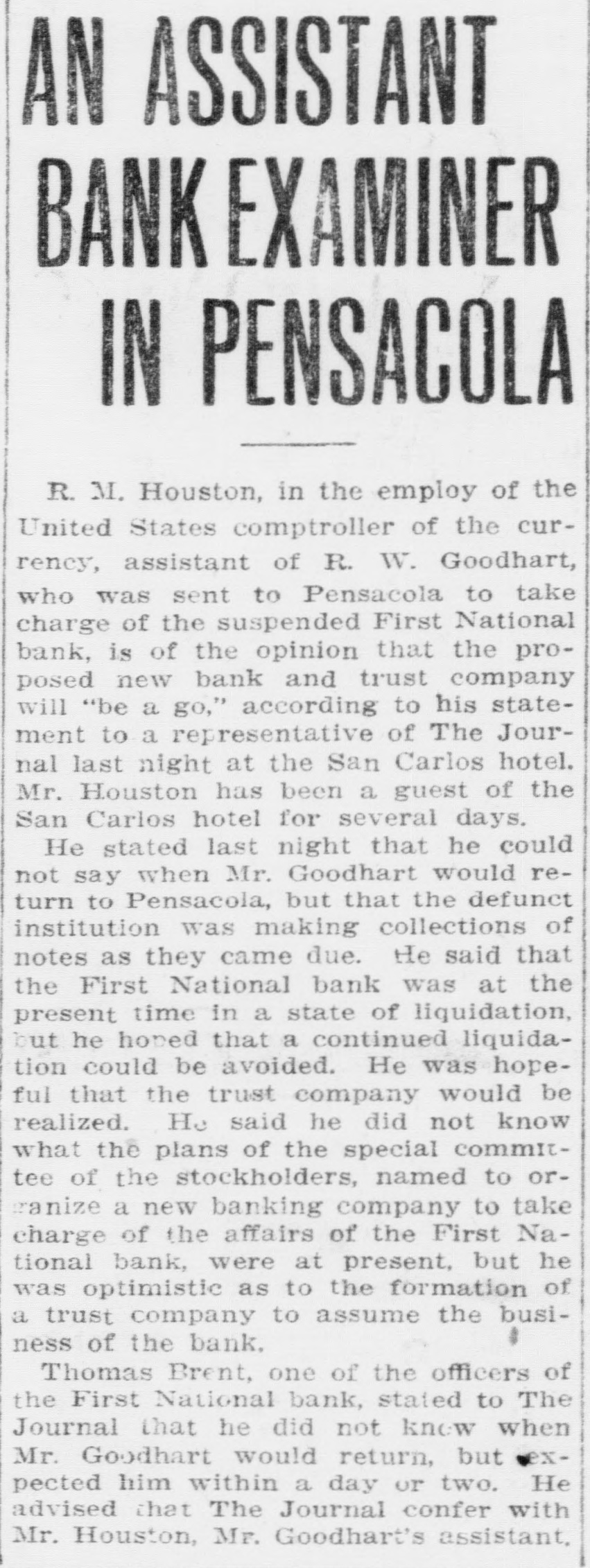 AN ASSISTANT BANK EXAMINER IN PENSACOLA R. M. Houston, in the employ of the United States comptroller of the currency, assistant of R. W. Goodhart, who was sent to Pensacola to take charge of the suspended First National bank, is of the opinion that the proposed new bank and trust company will "be a go," according to his statement to a representative of The Journal last night at the San Carlos hotel. Mr. Houston has been a guest of the San Carlos hotel for several days. He stated last night that he could not say when Mr. Goodhart would return to Pensacola, but that the defunct institution was making collections of notes as they came due. He said that the First National bank was at the present time in a state of liquidation, but he honed that a continued liquidation could be avoided. He was hopeful that the trust company would be realized. He said he did not know what the plans of the special committee of the stockholders, named to orranize a new banking company to take charge of the affairs of the First National bank, were at present, but he was optimistic as to the formation of a trust company to assume the business of the bank. Thomas Brent, one of the officers of the First National bank, stated to The Journal that he did not know when XMr. Goodhart would return, but pected him within a day or two. He advised that The Journal confer with Mr. Houston, Mr. Goodhart's assistant,
