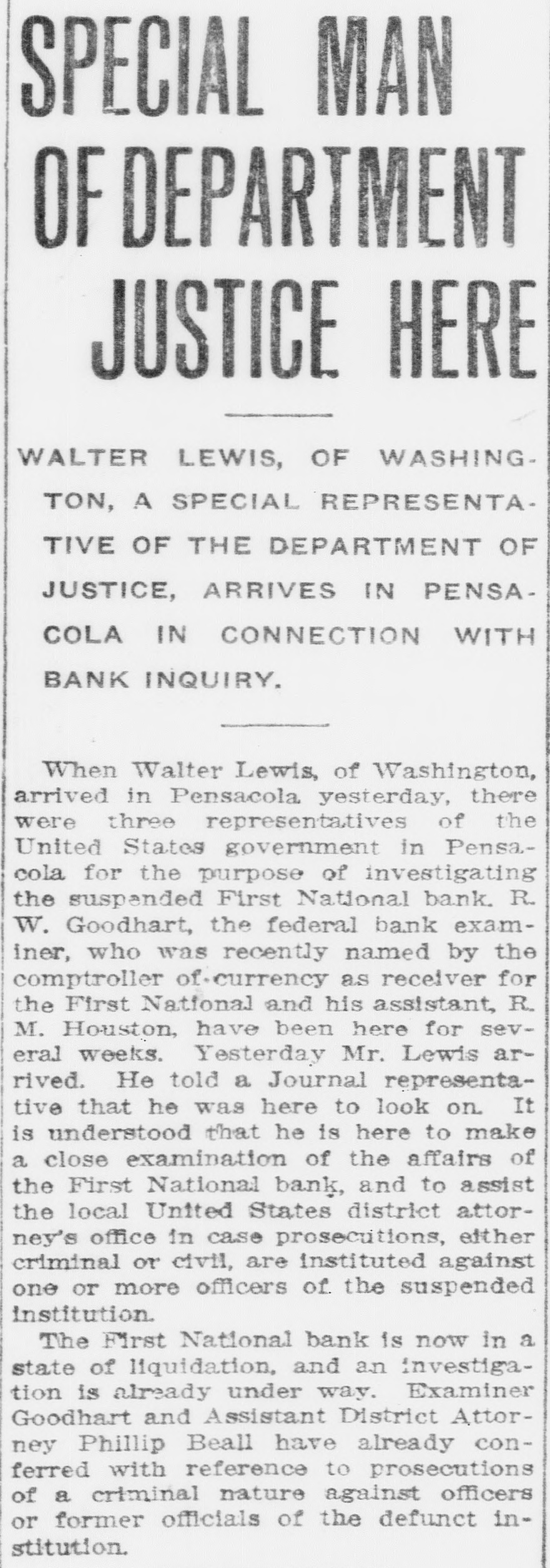 SPECIAL MAN OF DEPARTMENT JUSTICE HERE WALTER LEWIS, OF WASHINGTON, A SPECIAL REPRESENTATIVE OF THE DEPARTMENT OF JUSTICE, ARRIVES IN PENSACOLA IN CONNECTION WITH BANK INQUIRY. When Walter Lewis, of Washington, arrived in Pensacola yesterday, there were three representatives of the United States government in Pensacola for the purpose of investigating the suspended First National bank. R. W. Goodhart, the federal bank examiner, who was recently named by the comptroller of-currency as receiver for the First National and his assistant, R. M. Houston, have been here for several weeks. Yesterday Mr. Lewis arrived. He told a Journal representative that he was here to look on. It is understood that he is here to make a close examination of the affairs of the First National bank, and to assist the local United States district attorney's office in case prosecutions, either criminal or civil, are instituted against one or more officers of the suspended institution. The First National bank is now in a state of liquidation, and an investigation is already under way. Examiner Goodhart and Assistant District Attorney Phillip Beall have already conferred with reference to prosecutions of a criminal nature against officers or former officials of the defunct institution.