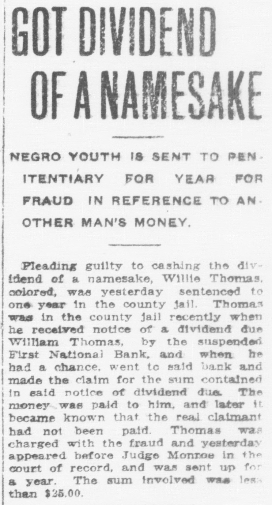 GOT DIVIDEND OF A NAMESAKE NEGRO YOUTH 18 SENT TO PEN. ITENTIARY FOR YEAR FOR FRAUD IN REFERENCE TO ANOTHER MAN'S MONEY. Pleading guilty to cashing the dividend of a namesake, Willie Thomas. colored, was yesterday sentenced to one year in the county Jail. Thomas was in the county Jail recently when he received notice of a dividend due William Thomas, by the suspended First National Bank, and when he had a chance. went to said bank and made the claim for the sum contained in said notice of dividend due The money was paid to him, and later it became known that the real claimant had not been paid. Thomas was charged with the fraud and yesterday appeared before Judge Monroe in the court of record, and was sent up for & year. The sum involved was less than $25.00.