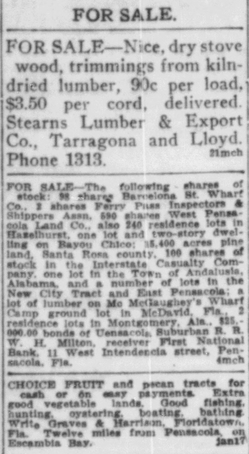 FOR SALEβThe following shares of stock: 98 shares Barcelona St. Wharf Co., 2 shares Ferry Pass Inspectors & Shippers Assn, 590 shares West Pensacola Land Co., also 240 residence lots in Hazelhurst, one lot and two-story dwelling on Bayou Chico; 15,400 acres pine land, Santa Rosa county, 100 shares of stock in the Interstate Casualty Company, one lot in the Town of Andalusia, Alabama, and a number of lots in the New City Tract and East Pensacola; a lot of lumber on Mc McGaughey's Wharf Camp ground lot in McDavid, Fla., 2 residence lots in Montgomery, Ala., $25,000.00 bonds of Uensacola, Suburban R. R. W. H. Milton, receiver First National Bank, 11 West Intendencia street, Pensacola, Fla.