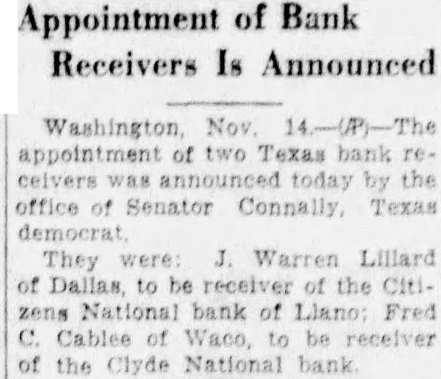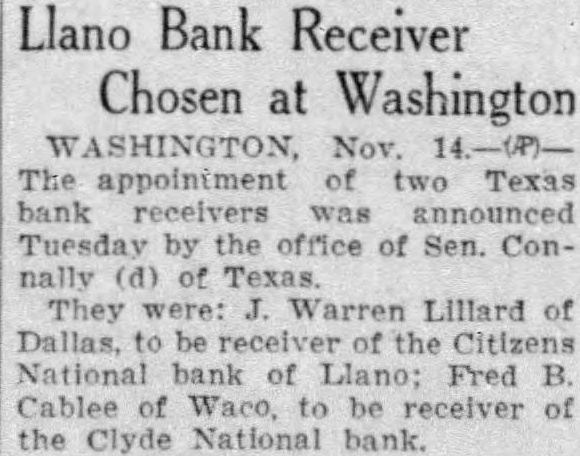 Llano Bank Receiver Chosen at Washington Nov. The appointment two Texas bank receivers was announced Tuesday by the office of Sen. Connally (d) of Texas. They were: Warren Lillard of Dallas, be the Citizens National of Llano; Fred B. Cablee of Waco, be receiver the Clyde National bank.