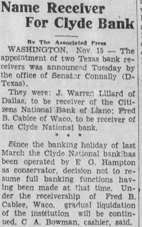 The appointment of two Texas bank receivers was announced Tuesday ... Fred B. Cablee of Waco, to be receiver of the Clyde National bank. Under the receivership of Fred B. Cablee, Waco, gradual liquidation of the institution will be continued, C A. Bowman, cashier, said. (Nov. 15, 1933).