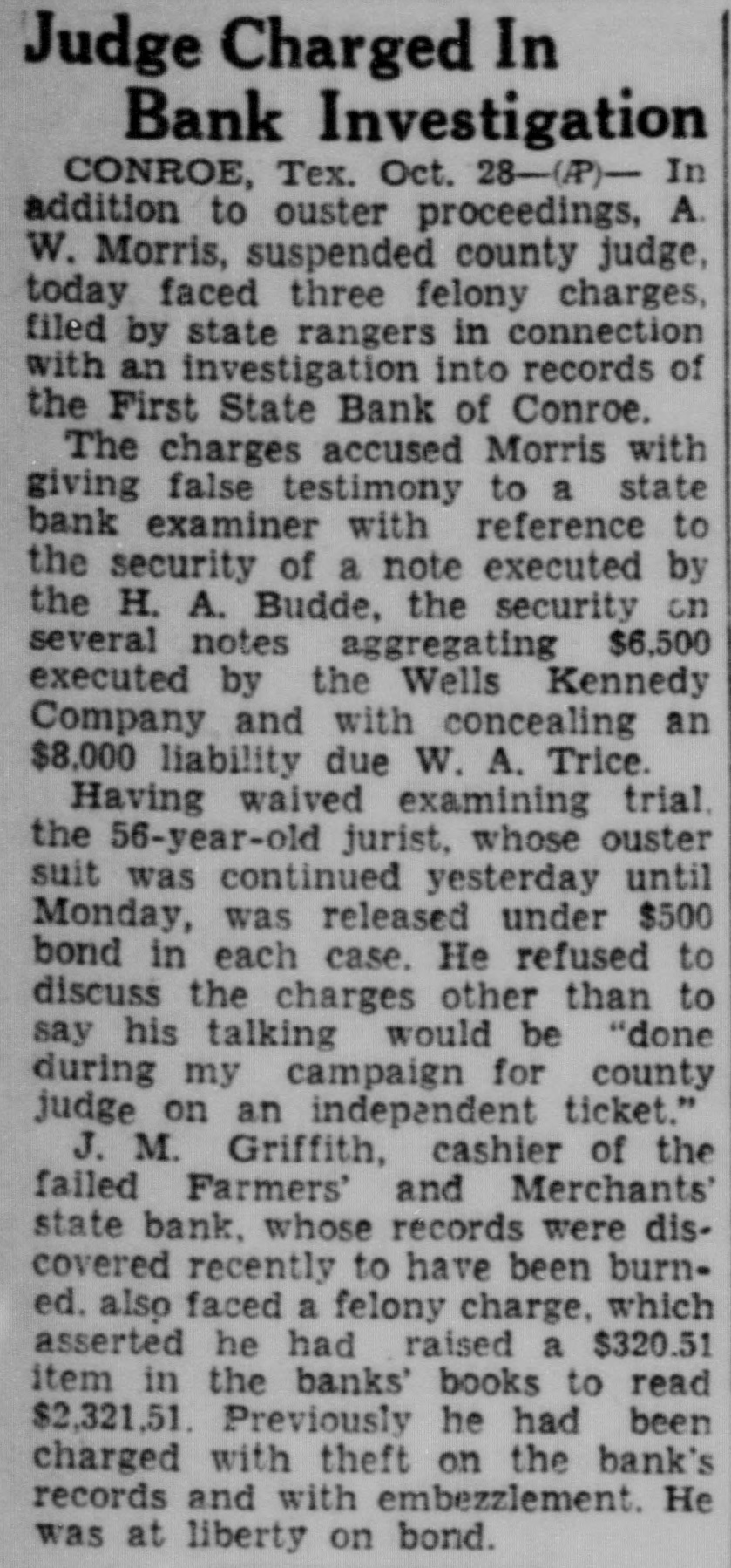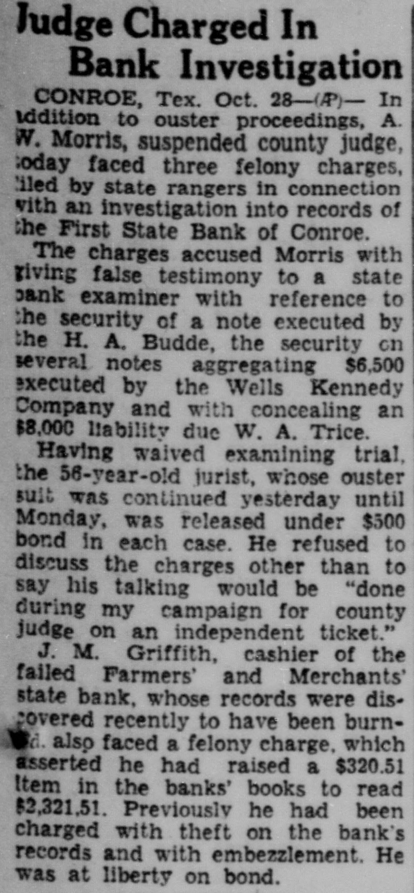 # Judge Charged In # Bank Investigation CONROE, Tex. Oct. 28—(P)— In addition to ouster proceedings, A. W. Morris, suspended county judge, today faced three felony charges, filed by state rangers in connection with an investigation into records of the First State Bank of Conroe. The charges accused Morris with giving false testimony to a state bank examiner with reference to the security of a note executed by the H. A. Budde, the security on several notes aggregating $6,500 executed by the Wells Kennedy Company and with concealing an $8,000 liability due W. A. Trice. Having waived examining trial, the 56-year-old jurist, whose ouster suit was continued yesterday until Monday, was released under $500 bond in each case. He refused to discuss the charges other than to say his talking would be "done during my campaign for county judge on an independent ticket." J. M. Griffith, cashier of the failed Farmers' and Merchants' state bank, whose records were discovered recently to have been burned. also faced a felony charge, which asserted he had raised a $320.51 Item in the banks' books to read $2,321,51. Previously he had been charged with theft on the bank's records and with embezzlement. He was at liberty on bond.