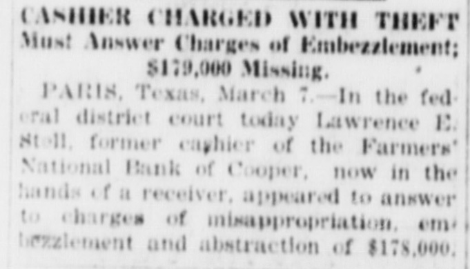 CASHIER CHARGED WITH THEFT Must Answer Charges of Embezzlement; $179,000 Missing. PARIS. Texas, March 7.-In the fedoral district court today Lawrence E. Stell former cashier of the Farmers' National Bank of Cooper, now in the hands of a receiver appeared to answer to charges of missappropriation embezzlement and abstraction of $178,000.