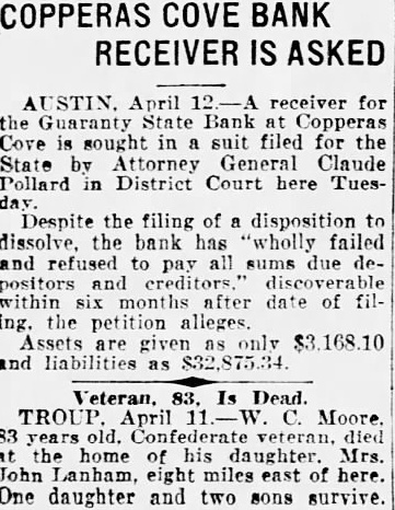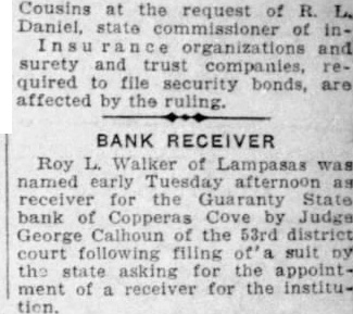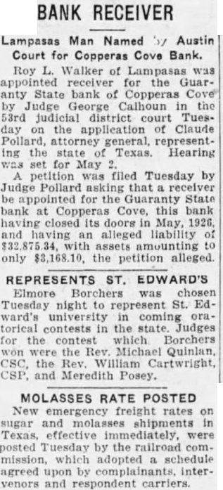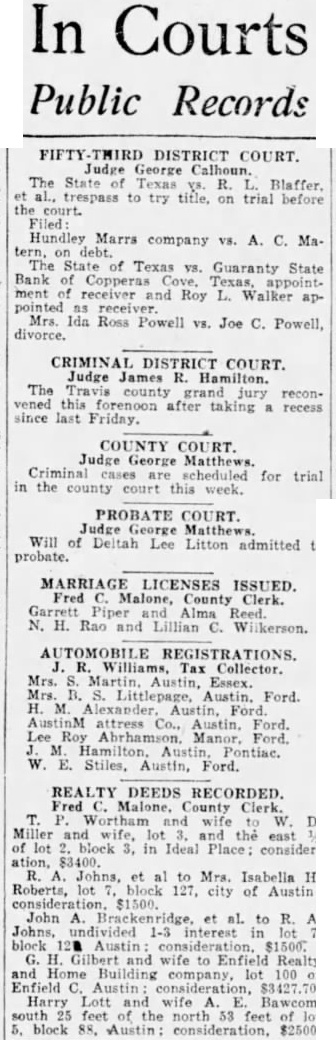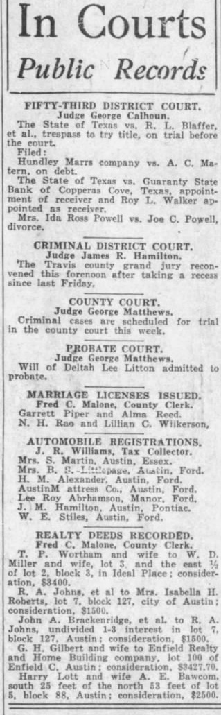 In Courts Public Records FIFTY THIRD DISTRICT COURT. Judge George The State Texas al., trespass to try title, on R. trial Blaffer. before Hundley Marrs company vs. A. C. Ma. tern, The State Texas ys. Guaranty State Bank Copperas Texas, of receiver and Roy L. Walker appointed receiver Mrs. Ida Ross Powell vs. Joe C. Powell, CRIMINAL DISTRICT COURT. Judge James The Travis county jury reconvened this forenoon after taking recess since last Friday. COUNTY COURT Judge George Matthews cases are scheduled for trial in the court this week. PROBATE COURT. Judge Matthews Will of Deltah Lee Litton admitted to probate. MARRIAGE LICENSES ISSUED Fred Malone, County Clerk. Garrett Piper Alma Reed. N. H. Rao and Lillian C. Wilkerson. Williams, Tax Collector. Mrs. Martin, Austin, Essex. Ford AustinM attress Co., Austin, Lee Ford. Stiles, Austin, Ford. REALTY DEEDS RECORDED Fred Malone, County Clerk. Wortham and and wife, and the east lot in Ideal Place: consideration, Johns, et to Mrs. Isabella H. Roberts, lot 127, city of Austin: John to Johns, 1-3 interest block wife to Realty Home Building 100 Enfield Austin Harry Lott and wife Bawcom. feet of the north 53 feet block 88, Austin: consideration, $2500.