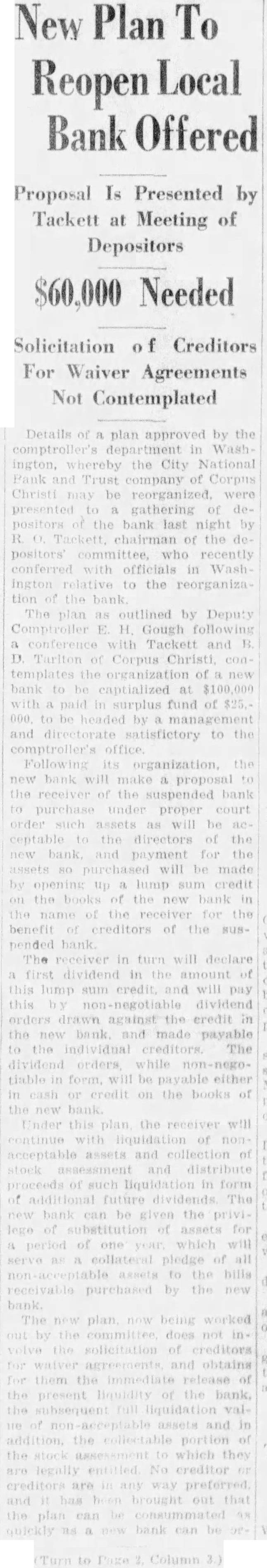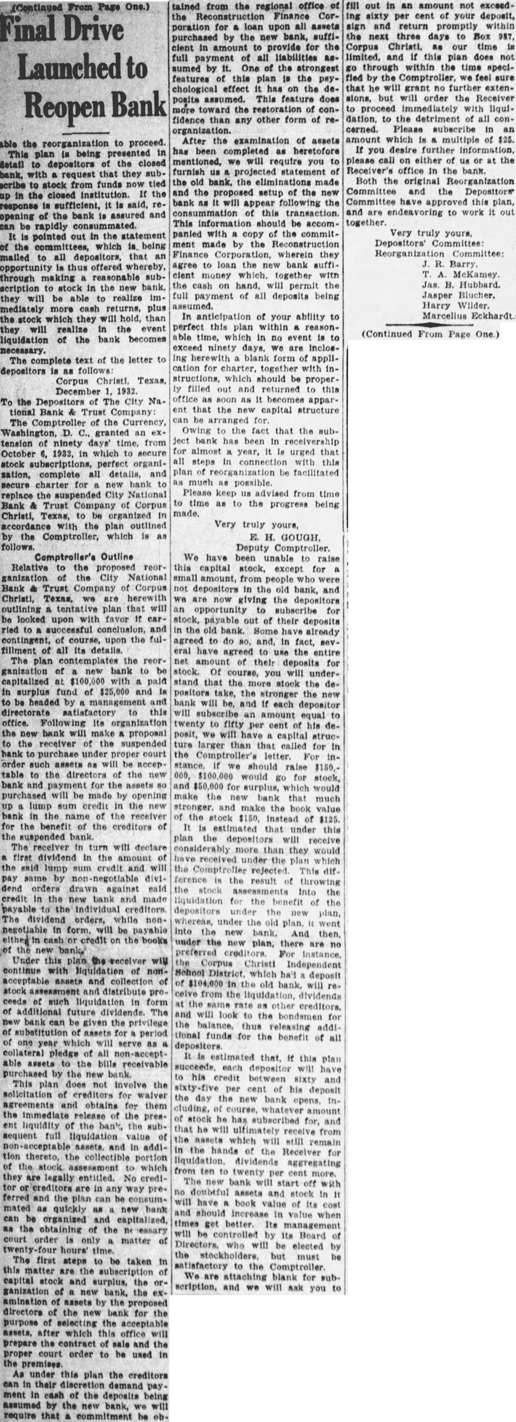 (Continued From Page One.) Final Drive Launched to Reopen Bank the reorganization to proceed. This plan being presented in detail to depositors the closed bank. with request that they subscribe to stock from funds now tied up in the closed institution. the response is sufficient, it is said, opening of the bank is assured and can be rapidly consummated. pointed out in the statement of the committees, which is being mailed to all depositors, that an opportunity offered whereby, through making subscription stock in the new bank. they will be realize im. mediately more cash returns, plus the which they will hold, than they will realize the event liquidation of the bank becomes necessary. The complete text of the letter to depositors Corpus Christi. December 1932. To the Depositors of The City National Bank Trust Company The Comptroller of the Currency, Washington, granted an tension ninety days' time. from October 1932, which secure stock subscriptions, perfect organisation, complete all details, and secure charter for new bank to replace the suspended City National Bank Trust Company of Corpus Christi, Texas, be organized in accordance with the plan outlined by the Comptroller, which is follows.