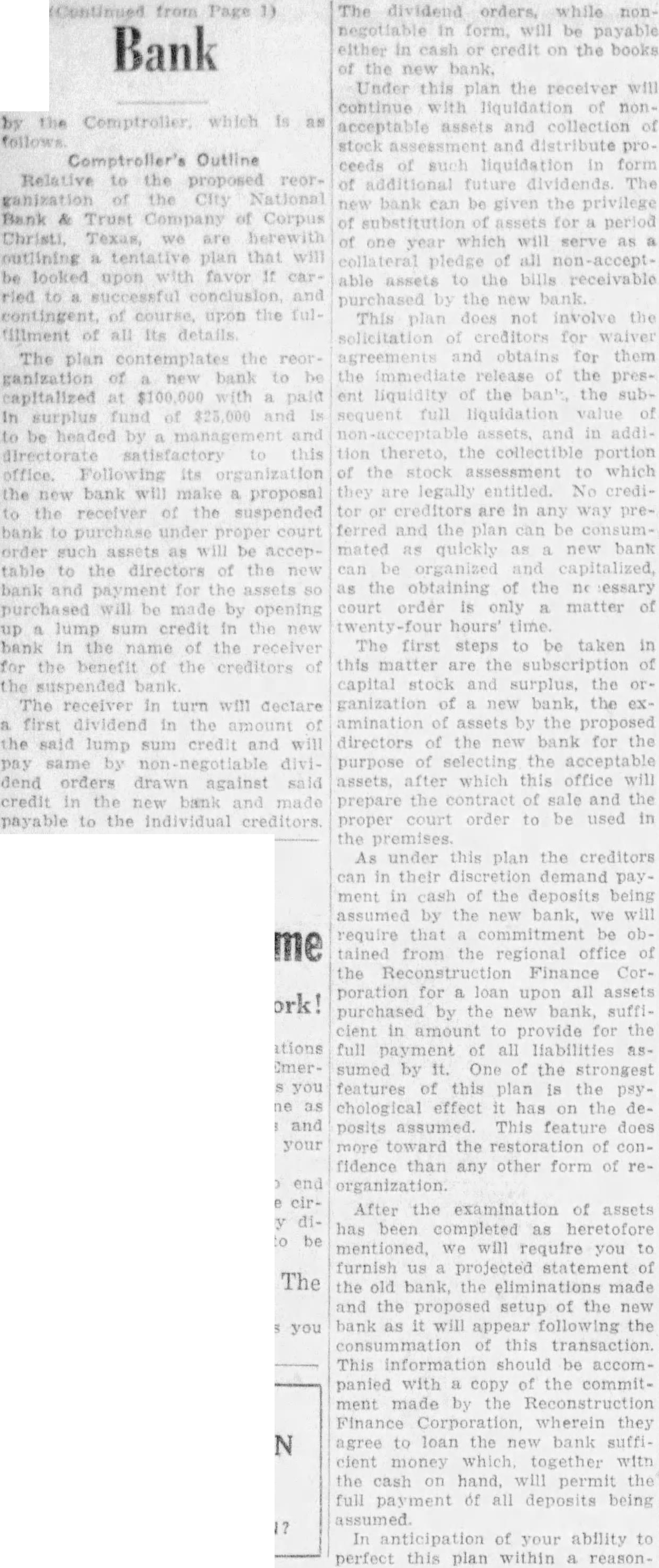 Comptroller's Outline Relative the proposed reorganization City National Bank & Trust Company of Corpus Christi, we are outlining tentative plan that will looked upon with favor carried successful conclusion. course, upon the fulfillment all its details. The plan contemplates the reorganization of new bank to capitalized $100,000 with paid surplus fund of $25,000 and be headed by management and directorate satisfactory this office. Following its organization the bank will make proposal the receiver the suspended bank purchase under proper court order such assets as will be acceptable to the directors the new bank and payment for the assets purchased made by opening lump sum credit in the new bank in the of the receiver for the benefit of the creditors of suspended The receiver in turn will declare first dividend in the amount the said lump sum credit and will pay same by dividend orders drawn against said credit in the bank and made payable the creditors. The orders, while nonform, will be payable credit on the books the Under this plan continue of nonacceptable assets and collection of stock and distribute proceeds such liquidation in form of additional future The new bank can be given the privilege substitution for period one year which will serve collateral pledge of all able assets the bills receivable purchased by the new bank. This plan does not involve the solicitation of creditors for waiver agreements and obtains for them the immediate the present liquidity bank, the subsequent full liquidation value assets. and in addition thereto, the collectible portion the stock assessment which they are legally entitled. No credifor creditors in any ferred and the plan can consummated as quickly new bank can be organized and capitalized, the obtaining of the essary court order only matter of hours' time. The first steps be taken in this matter are the subscription capital stock and surplus, the ganization new bank, the amination of assets by the proposed directors of the new bank for the purpose of selecting the acceptable assets, after which this office will prepare the contract of sale and the proper court order to be used the As under this plan the creditors can their demand payment in cash of the deposits being assumed by the new bank, require that commitment be tained from the regional office of the Reconstruction Finance Corporation for loan upon all assets purchased by the new bank, sufficient in amount to provide for the full payment of all liabilities assumed by One of the strongest features of this plan is the paychological effect has on the deposits assumed. This feature does more toward the confidence than any other form of reorganization. After the examination of assets has been completed as heretofore mentioned, we will require you furnish projected the old bank. the made and the setup of the new bank will appear following the this This information should be accompanied with copy of the commitment made by the Finance wherein they agree to loan the bank sufficient which with the cash on hand, will permit the full of all deposits being In anticipation of your ability to perfect this plan within able time, in no event is exceed ninety days, are Inclosing herewith blank form application for charter, together with instructions, which should be properfilled out and returned this office soon becomes apparent that the capital structure can arranged Owing the fact that the subject bank has been in receivership for almost year, urged that steps connection with plan reorganization facilitated much possible. Please keep us advised from time to time as to the progress being made.