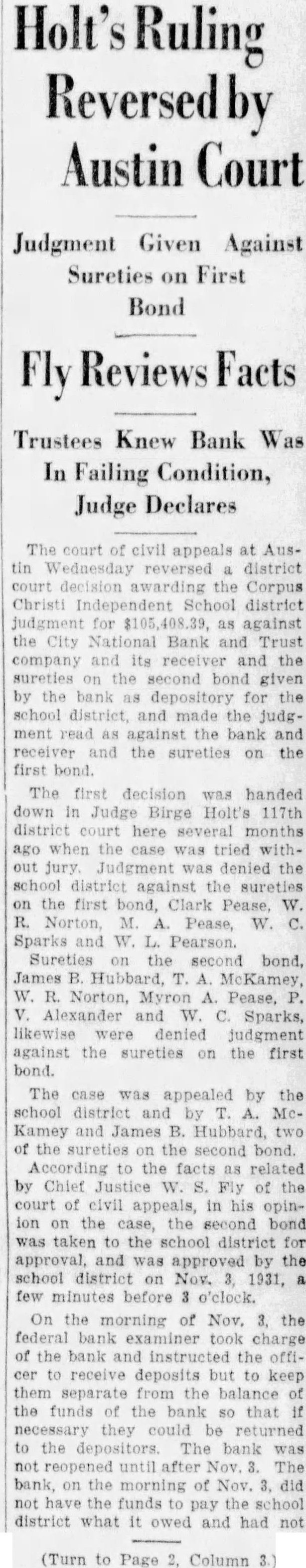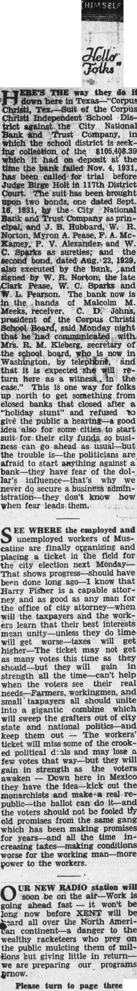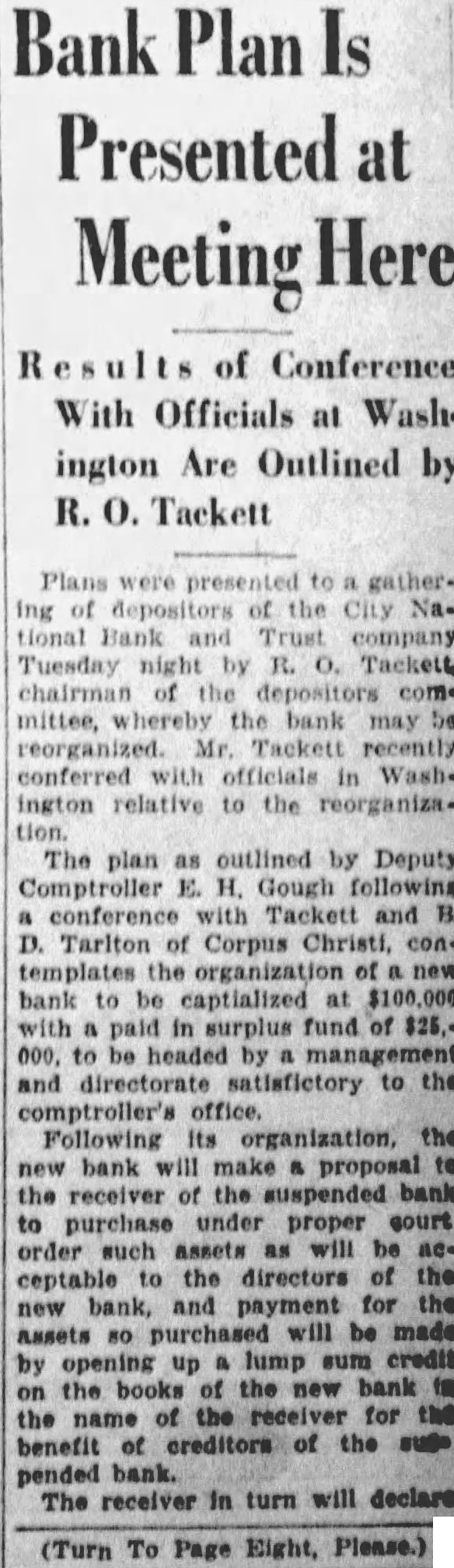 H. GOUGH, Deputy Comptroller. We have been unable to raise this capital stock, except for small amount, from people not depositors the old bank, and we giving the depositors opportunity subscribe for stock, payable out of their deposits the old bank. Some already agreed to do and, in fact, several have agreed use the entire net amount of their deposits for stock. Of course, you will understand that the more stock the depositors take, the stronger the new bank will and each depositor will subscribe amount equal twenty to fifty per cent of his deposit, we will have capital structure larger than that called for the Comptroller's letter. For inshould raise 000, $100,000 would for stock, and $50,000 for surplus, which would make bank that much stronger. and make the book value the stock $150, instead of $125. estimated that under this plan the depositors receive considerably more than they would received under the plan which the Comptroller rejected. This dif. ference the result throwing the stock assessments into the liquidation for the benefit of the depositors under the plan, whereas, under old plan. went into the bank. And then, under plan, there are no preferred For Corpus Christi Independent School District. which hall deposit $104,000 In the old bank, will celve from the liquidation, dividends rate creditors. and will look the bondsmen for balance, thus releasing additional funds for the benefit of all estimated that, if this plan depositor will his credit between sixty and per cent of his deposit the day the new bank whatever amount of stock he has for, and that he will receive from the assets which will still remain the hands the Receiver for dividends aggregating from ten twenty more. The new bank will start off doubtful assets and stock will have book value of cost and should Increase value when times get better. Its management be controlled by Board who elected the stockholders, but must to the We are blank for suband we will ask fill out in an amount not exceedsixty per cent of your deposit, sign and return promptly within the next three days to Box 987, Corpus as our time limited. and if this plan does not go through within the time specified by the Comptroller, we feel that he will grant no extensions, but will order the Receiver proceed immediately with liquidation, to the detriment all concerned. Please subscribe amount which multiple $25. you desire please call either at the Receiver's office in the bank. Both the original Committee and the Depositors Committee have this plan, and are endeavoring to work out together.