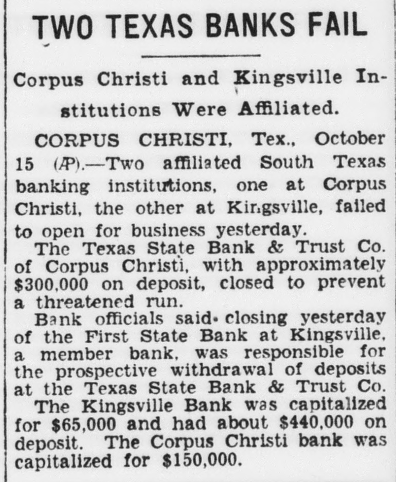 TWO TEXAS BANKS FAIL Corpus Christi and Kingsville Institutions Were Affiliated. CORPUS CHRISTI, Tex., October 15 (P).-Two affiliated South Texas banking institutions, one at Corpus Christi, the other at Kingsville, failed to open for business yesterday. The Texas State Bank & Trust Co. of Corpus Christi, with approximately $300,000 on deposit, closed to prevent a threatened run. Bank officials said. closing yesterday of the First State Bank at Kingsville, a member bank, was responsible for the prospective withdrawal of deposits at the Texas State Bank & Trust Co. The Kingsville Bank was capitalized for $65,000 and had about $440,000 on deposit. The Corpus Christi bank was capitalized for $150,000.