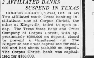 2 AFFILIATED BANKS SUSPEND IN TEXAS CORPUS CHRISTI, Texas, Oct. 14. (AP) Two south Texas banking institut one at Corpus Christi, the other at Kingsvi failed to open today. The Texas State Bank and Trust of Corpus Christi, with approximately $300,000 on deposit, closed to prevent threatened run. The Kingsville bank was capitalized for $65,000 and had about $440,000 on deposit. The Corpus Christi bank was capitalized for $150,000.