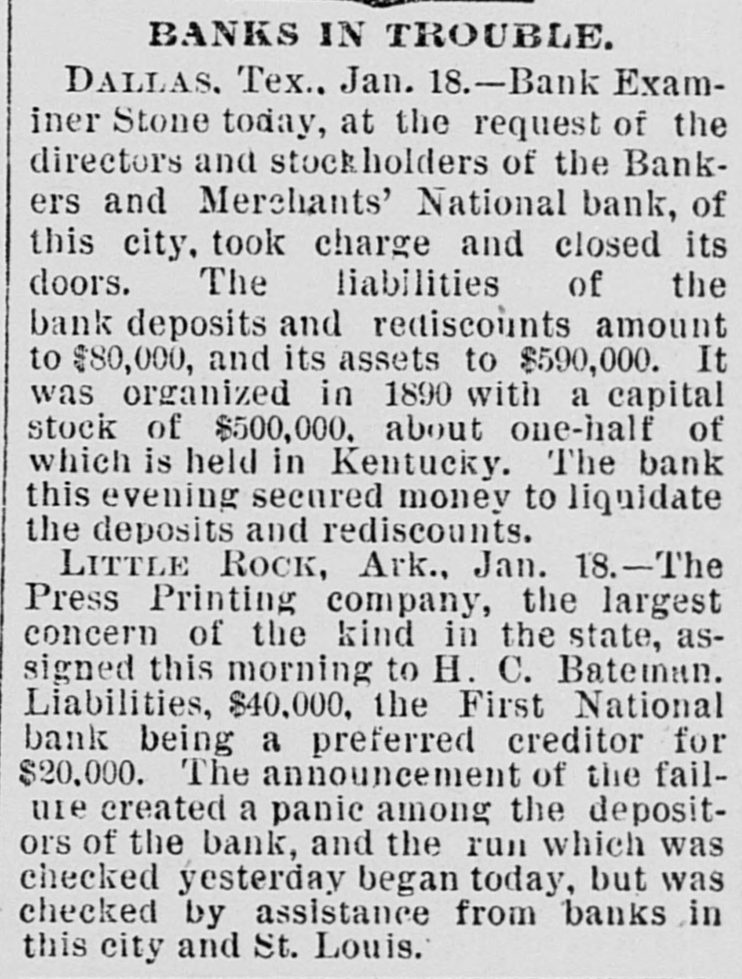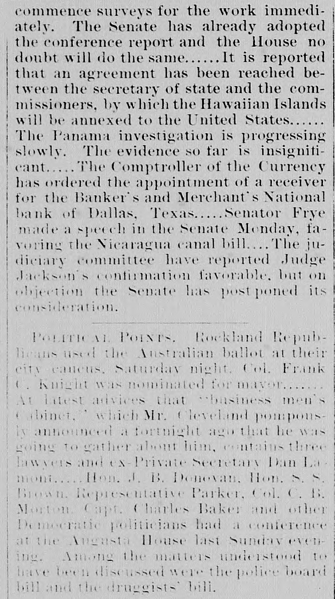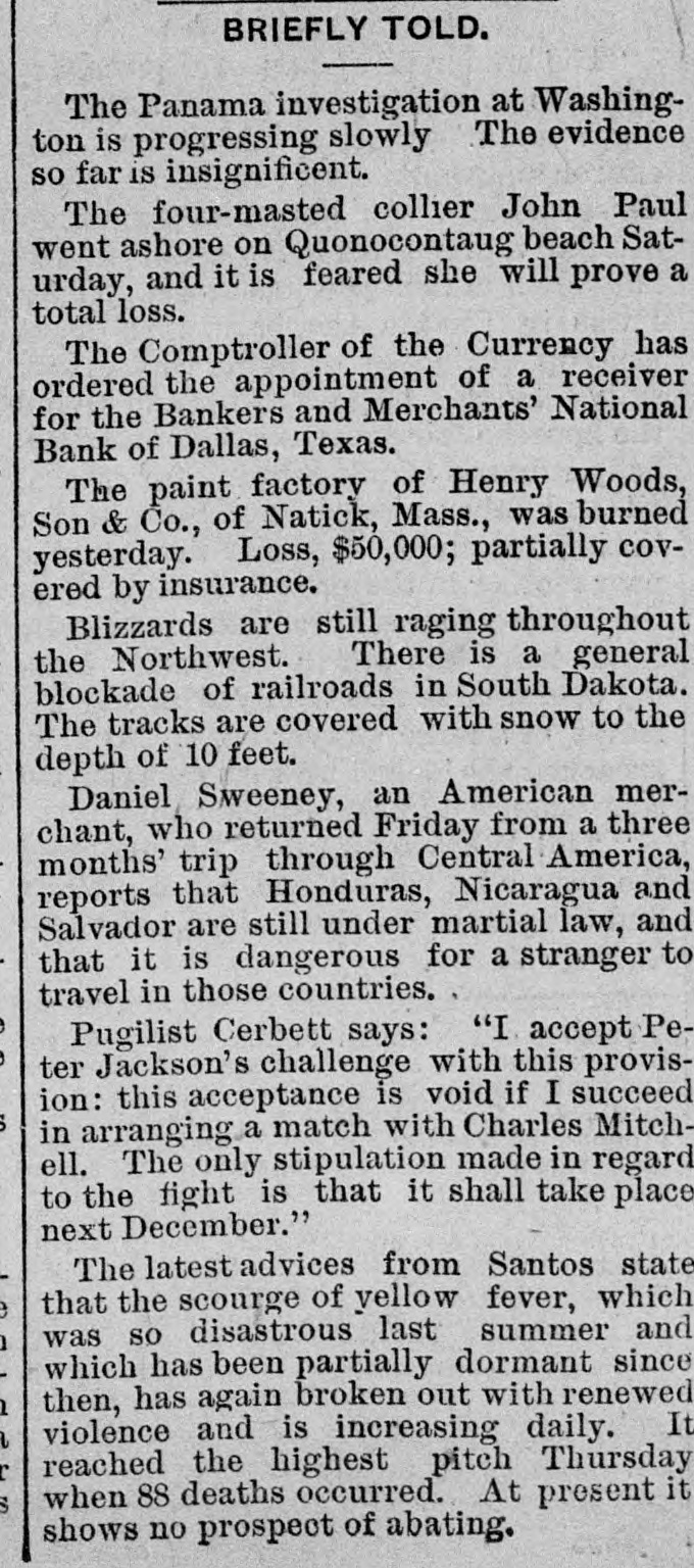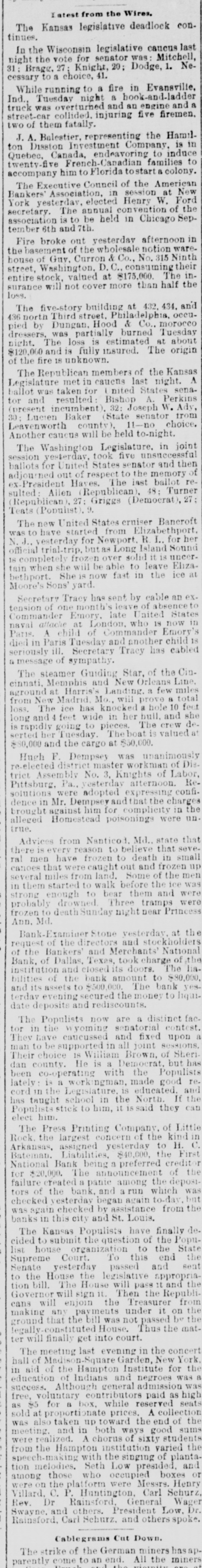 tinues. In the Wisconsin legislative caucus last night the vote for senator was: Mitchell, 31: Bragg. 27 Knight, 20: Dodge, 1. Necessary to a choice, 41. While running to a fire in Evansville, Ind., Tuesday night 8 book-and-ladder truck was Perturned and an engine and street-car collided. injuring five firemen. two of them fatally. A. Balestier, representing the Hamilton Disston Investment Company. is in Quebec, Canada, endeavoring to induce twenty-five French-Canadian families to accompany him Florida tostart a colony. The Executive Council of the American Bankers Association, in session at New York yesterday, elected Henry W. Ford secretary. The annual convention of the association is to be held in Chicago September 6th and 7th. Fire broke out yesterday afternoon in the basement of the wholesale notion house of Guv. Curron & Co., No. 315 Ninth street, Washington. D.C., consuming their entire stock, valued at $175,000. The insurance will not cover more than half the loss. The five-story building at 432, 434, and 436 north Third street, Philadelphia, occupied by Dungan. Hood & Co., morocco dressers, was partially burned Tuesday night. The loss is estimated at about $120,000 and is fully insured. The origin of the fire 18 unknown. The Republican members of the Kansas A Legislature met in cauens last night. ballot was taken for nited States senator and resulted: Bishop A. Perkins (present incumbent). 32: Joseph W. Ady, Lucien Baker (State senator from Leavenworth county), 11-no choice. Another caucus will be held to-night. The Washington Legislature. in joint session yesterday, took five unsuccessful ballots for United States senator and then adjourned out of respect to the memory of ex-President Haves. The last ballot resulted: Ailen Republican). 48: Turner 27: Republican). 27 Griggs (Democrat) Teats (Populist) 9. The new United States cruiser Bancroft was to have started from Elizi abethport. her N.J., yesterday for Newport. R I.. for official trial-trip. but as Long Island Sound completely frozen solid is uncertain when she will be able to leave Eliza. bethport. She is now fast in the ice at Moore's Sons' yard. Secretary Tracy has sent by cable an tension of one month leave of absencet Commander Emory. late United States naval attache at London, who 18 now in Paris. child of Commander Emory died in Paris Tuesday and another child seriously ill. Secretary Tracy has cabled message of sympathy. The steamer Guiding Star, of the Cincinnati, Memphis and New Orleans Line aground at Harris' Landing. a few miles from New Madrid, Mo., will prove a total feet loss. The ice has knocked a hole 10 she long and feet wide in her bull. and de is rap:dly going to pieces. The crew serted her Tuesday. The boat is valued $80,000 and the cargo at $50,000. Hugh F. Dempsey was unanimously Dis re-elected district master workman of trict Assembly No. 3, Knights of Labor, RePittsburg, Pa., yesterday atternoon. solutions were adopted expressing confidence in Mr. Dempsey an ithat the charge the brought against him for complicity in alleged Homestead poisonings were un true. Advices from Nanticod. Md., state that there is every reason to believe that sevemen have frozen to death in small ral canoes that were caught out and frozen up several miles from land. Some of the men them started to walk before the ice in strong enough to bear them and were probably drowned Three tramps were frozen to death Sunday night near Princess Ann. Md. Bank-Examiner Stone yesterday. at th of the directors and stockholders of request the Bankers' and Merchants' National Bank, of Dallas, Texas, took charge of the liainstitution and closed its doors. The bilities of the bank amount to $80,000. yesand its assets to $500,000. The bank terday evening secured the money to liquideposits and rediscounts. The Populists now are a distinct fac in the wyoming senatorial contest. tor They have caucussed and fixed sessions upon man to be supported in all joint Their choice 18 William Brown, of Shericounty. He is a Democrat. but has dan been co-operating with the Populists re. is a workingman, made good lately cord in the Legislature, is educated. and the has taught school in the North. If can Populists stic to him, it is said they elect him. The Press Printing Company. of Little Rock. the largest concern of the kind C. in Arkansas, assigned yesterday to H. First Bateman. Liabilities. $40,000. the National Bank being a preferred credit of the $20,000. The announcement failure for created a panic among the deposiof the bank, and run which was but checked tors vesterday again to-day the was again checked by assistance from banks this city and St. Louis. The Kansas Populists have finally de. cided to submit the question of the Popu- State list house organization to the the To end this Supreme Court. sent Senate yesterday passed and the House the legislative appropria the to The House will pass t and tion bill. Governor will sign it Then the Republi- from will enjoin the Treasurer cans any payments under it on the making ground that the bill was not passed the by mat- the legally- House. Thus ter will finally get into court. The meeting last evening in the concert of Madison-Square Garden, New York, the hall aid of the Hampton Institute for in of Indians and negroes was education Although general admission success. voluntary contributors paid as seats high free, for box, while reserved as $5 at proporti onate prices. A collection the sold taken up toward the end of was also and in both ways good sums meeting. realized. A chorus of sixty students the were the Hampton institution varied from with the singing of planta speech-making Seth Low presided. and tion melodies. those who occupied boxes or among the platform were Messry. Henry Villard. were on C.P. Huntington. Carl Schurz Wager Dr Rainsford, General Rev. and others. President Low. Dr. Rainsford, Swayne. Carl Schurz. and others spoke Cablegrams Cut Down. strike of the German miners miners hasap parentl