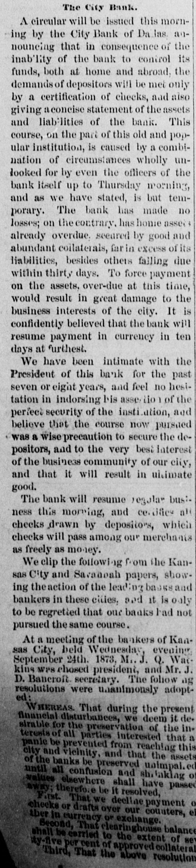 The City Bank. A circular will be issued this morning by the City Bank of Da las. announcing that in consequence of the inab'lity of the bank to control its funds, both at home and abroad. the demands of depositors will be met only by a certification of checks, and also giving a concise statement of the assets and liabilities of the bank. This course, on the part of this old and popular institution, is caused by a combination of circumstances wholly unlooked for by even the officers of the bank itself up to Thursday morning, and as we have stated, is but temporary. The bank has made no losses; on the contrary. has honie assets already overdue. secured by good and abundant collaterals, far in excess of its liabilities, besides others failing due within thirty days. To force payment on the assets, over-due at this time, would result in great damage to the business interests of the city. It is confidently believed that the bank will resume payment in currency in ten days at furthest. We have been intimate with the President of this bank for the past seven or eight years, and feel no hesitation in indorsing bis asses tio 1 of the perfect security of the institution, and believe that the course now pursued was a wise precaution to secure the depositors, and to the very best interest of the business community of our city, and that it will result in ulcimate good. The bank will resume regular bus:ness this morning, and certifics all checks drawn by depositors, which checks will pass among our merchants as freely as money. We clip the following from the Kansas City and Savanoah papers, showing the action of the leading basksand bankers in these cities, and it is only to be regretted that oue banks had not pursued the same course. At a meeting of the bankers of Kansas City, held Wednesday, evening September 24th. 1873, M. J. Q. Watkins WPS chosed president, and Mr. D. Bancroit. secretary. The follow ag resolutions were unanimously adopted: WHEREAS. That during the present financial disturbances, we deem it de. sirable for the preservation of the interests of all parties interested that a panic be prevented from reaching this city and vieinity, and that the assets of the banks be preserved unimpal. ed until all confusion and shriaking of values elsewhere shall have passed away; therefo.e be it resolved, First. That we decline payment checke or drafts over our counters, ei 0 ther in currency OF exchange. Second, That cerried to the per cent of sty-five shall be clearinghouse approved extent collateral balance of He Third, That the above resolution