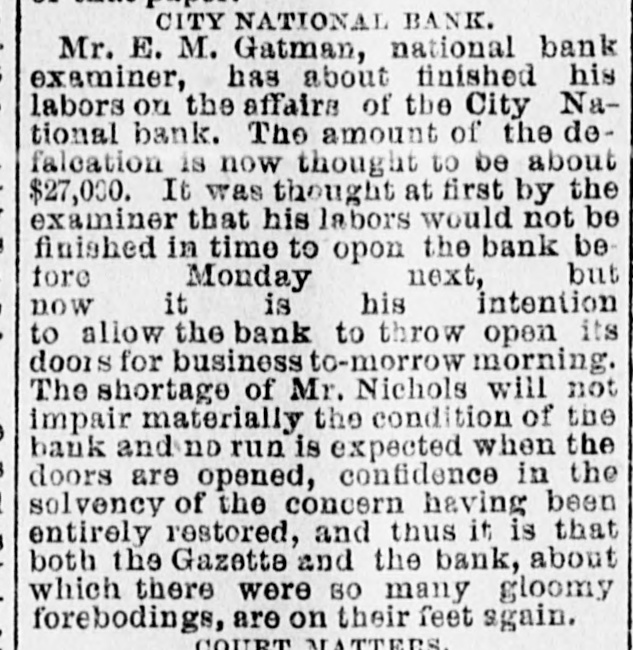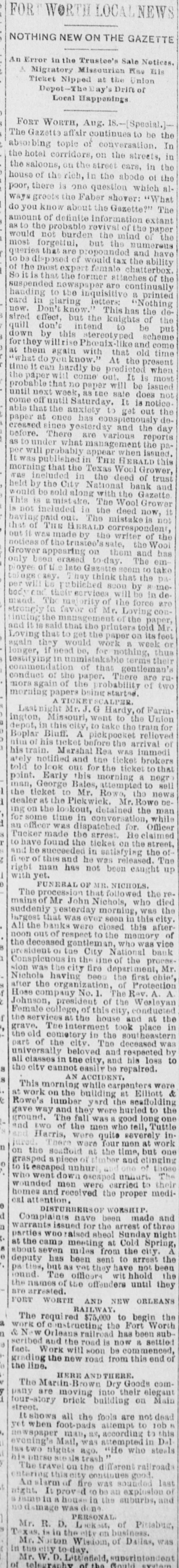 WORTH LOCALNEWS NG NEW ON THE GAZETTE or in the Trustee's Sale Notices. STTE AM volue and in peddiN 19% Depot-The Day's Drift of WORTH, Aug. 18.-[Special.]zette affair continues to be the u1 to ojdos Su 11 corridors, on the streets, in one, on the street cars, in the f the rich, in the abode of the ere is one question which alreots the Faber shover: "What know about the Gazette?" The of definite information extant e probable revival of the paper not burden the mind of the snoremina out anq that are propounded and have sposed of would tax the ability nost expert female chatterbox. that the former attaches of the led newspaper are continually g to the inquisitivo a printed glaring letters: "Nothing Don't know." This has the deffect, but the knights of the don't intend to be put by this stereotyped scheme willrise Phoenix-like and come n again with that old time to you know." At the present can hardly be predicted when or will come out. It is most ponsep eq TITAL reded on suq: e1 you soop 0.88 one 88 'HOOM THE notice RT 11 Type I our ano 705 01 Amixue the 11 -op seq 0000 71 since yesterday and the day There are various reports der what management the paI probably appear when issued. HHI u! g that the Texas Wool Grower, cluded in the deed of trust the City National bank and 00 sold along with the Gazette Grower 100M our B neluded in the deed now, it TOTE #1 our mo pivd HEREID 3HJ as made by the writer of the 100M our TO seq pus mom DO Supsedds -ure 94L pessio uo 03 шоен Grazone 1869 0 n JE asy. I hay think that the paour H sq 0008 99 their services will be in deThe brity of the force are -000 SUJACT "W JO JOANJ DJ the management of the paper, said that the printers told Mr. 1001 sur uo reduct eq2 102 04 That hey would work a week or if need be, for nothing, thus ng in unmistakable terms their ndation of that gentleman's -nJ OJB *seded our 10 7 gain of the probability of two buisq studed 8 SERVICE LIMOIL V night Mr. J. G Hardy,of FarmMissouri, went to the Union in this city, to take the train for Bluff. A pickpocket relieved his ticket before the arrival of SWA "" 'II otified and the ticket brokers look out for the ticket to that Early this morning a negr leorge Bales, attempted to sell ket to Mr. Rowo, the news at the Pickwick. Mr. Rowe bethe lookout, detained the man white up emp 01 or was dispatched for. Officer made the arrest. He claimed found the ticket on the street, succeeded in satisfying the ofthis and he was released. The man has not been caught up et. 'STOHOIN "HW ло procession that followed the reof Mr John Nichols, who died iy esterday morning, was the chip siq1 up ueos 2049 SEM 7841 banks were closed this after15 of respect to the memory of eased gentleman, who was vice nt Oi tue City National bank -secord eq: JO enn will up snone 14 the city fire department, Mr. a having been the first chief, Protection jo eq ompany No. 1. The Rev. A. A n, president of the Wesleyan 3 college, of this city, conducted eq1 14 pus osnoq 991 TH The interment took place in cemetery in the southeastern f the city. The deceased was sally beloved and respected by 01 1088 #14 pus 'Allo out us sost V cannot easily be repaired.