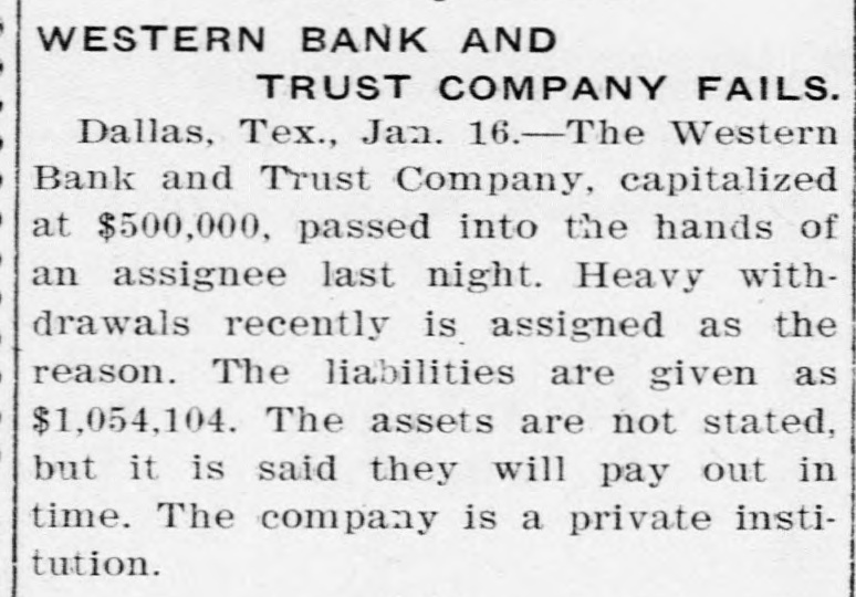 DALLAS BANK FAILS. Savings Institution Could Not Raise Enough Ready Cash. Dallas, Tex., January 16.-The Western Bank and Trust company of Dallas, the largest savings bank in Texas, has been placed in the hands of Henry D. Lindsley, with instruction to administer the affairs of the institution for the interest of its creditors. Officers of the bank declare that while on October 1 it was in the best of condition of its history, a quiet run has prevailed since that time, and to meet it they have paid out over $900,000. After sacrificing all of their quick assets and finding the remainder hard to dispose of under present financial conditions, they decided to make an assignment. The bank had a capital of $500,000 and over 4000 savings depositors. Its total liabilities are $1,054,104.53. A complete schedule of the assets has not been filed, but officers of the bank declare that depositors will lose nothing. There is some doubt, however, about the fate of the accounts of other creditors.