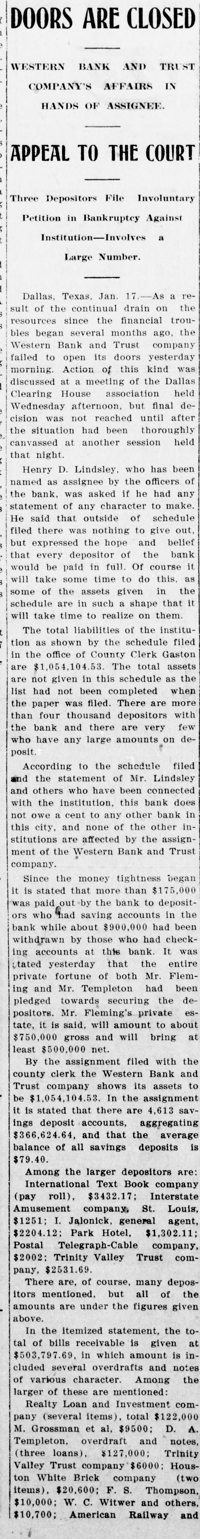 DOORS ARE CLOSED WESTERN BANK AND TRUST COMPANY'S AFFAIRS IN HANDS OF ASSIGNEE. APPEAL TO THE COURT Three Depositors File Involuntary Petition in Bankruptcy Against Institution-Involves a Large Number. Dallas, Texas, Jan. 17.-As a result of the continual drain on the resources since the financial troubles began several months ago, the Western Bank and Trust company failed to open its doors yesterday morning. Action of this kind was discussed at a meeting of the Dallas Clearing House association held Wednesday afternoon, but final decision was not reached until after the situation had been thoroughly canvassed at another session held that night. Henry D. Lindsley, who has been named as assignee by the officers of the bank. was asked if he had any statement of any character to make. He said that outside of schedule filed there was nothing to give out, but expressed the hope and belief that every depositor of the bank would be paid in full. Of course it will take some time to do this. as some of the assets given in the schedule are in such a shape that it will take time to realize on them. The total liabilities of the institution as shown by the schedule filed in the office of County Clerk Gaston are $1,054,104.53. The total assets are not given in this schedule as the list had not been completed when the paper was filed. There are more than four thousand depositors with the bank and there are very few who have any large amounts on deposit. According to the schedule filed and the statement of Mr. Lindsley and others who have been connected with the institution. this bank does not owe a cent to any other bank in this city, and none of the other institutions are affected by the assignment of the Western Bank and Trust company. Since the money tightness began it is stated that more than $175,000 was paid out by the bank to depositors who had saving accounts in the bank while about $900,000 had been withdrawn by those who had checking accounts at this bank. It was stated yesterday that the entire private fortune of both Mr. Fleming and Mr. Templeton had been pledged towards securing the depositors. Mr. Fleming's private estate, it is said, will amount to about $750,000 gross and will bring at least $500,000 net. By the assignment filed with the county clerk the Western Bank and Trust company shows its assets to be $1,054,104.53. In the assignment it is stated that there are 4,613 savings deposit accounts, aggregating $366,624.64, and that the average balance of all savings deposits is $79.40. Among the larger depositors are: International Text Book company (pay roll), $3432.17; Interstate Amusement company, St. Louis, $1251; I. Jalonick, general agent, $2204.12; Park Hotel, $1,302.11; Postal Telegraph-Cable company, $2002; Trinity Valley Trust company, $2531.69. There are, of course, many depositors mentioned, but all of the amounts are under the figures given above. In the itemized statement, the total of bills receivable is given at $503,797.69 in which amount is included several overdrafts and notes of various character. Among the larger of these are mentioned: Realty Loan and Investment company (several items), total $122,000 M. Grossman et al. $9500; D. A. Templeton, overdraft and notes, (three loans), $127,000; Trinity Valley Trust company $6000; Houston White Brick company (two items), $20,600; F. S. Thompson, $10,000; W. C. Witwer and others, $10,700; American Railway and