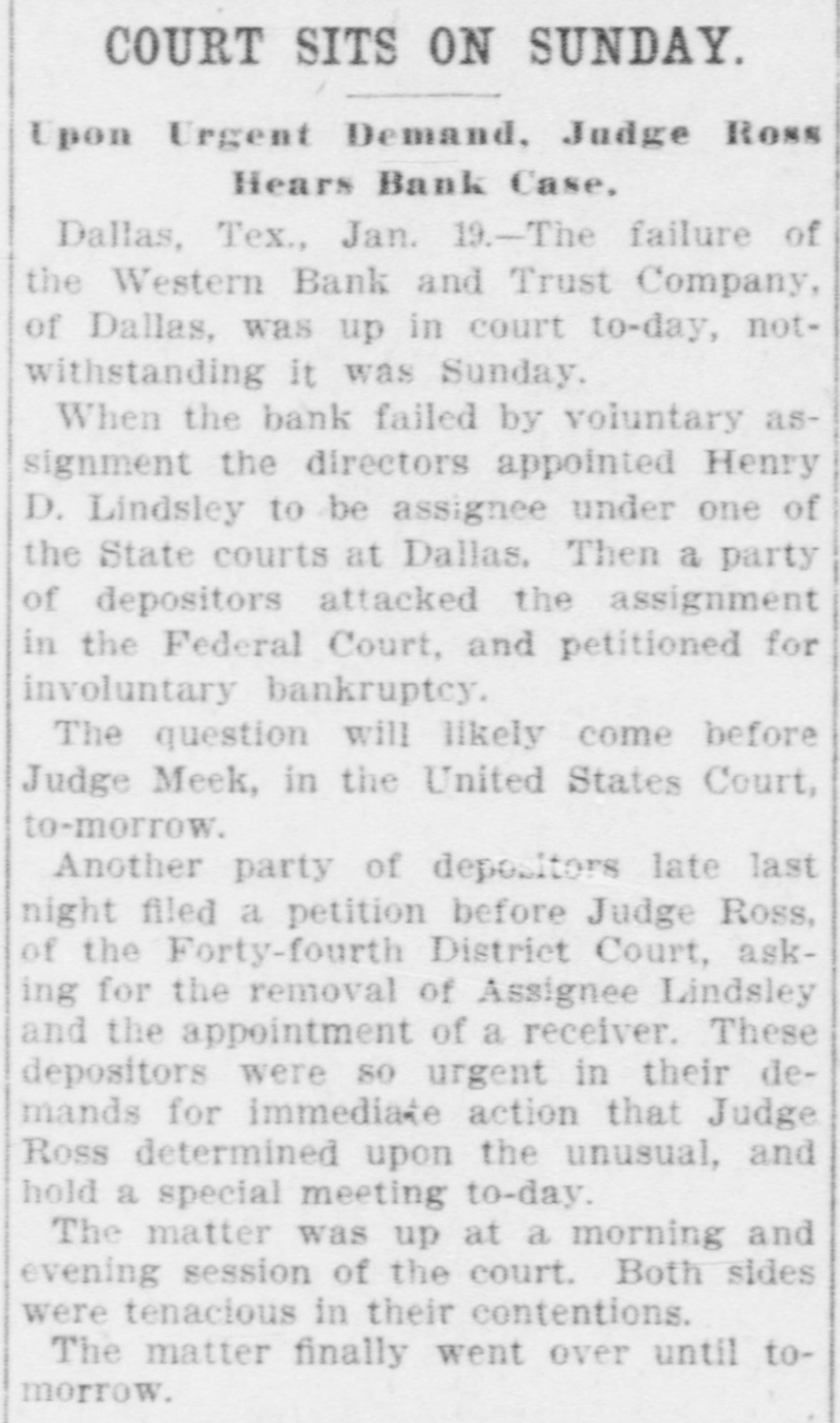 COURT SITS ON SUNDAY. Upon Urgent Demand, Judge Ross Hears Bank Case, Dallas, Tex., Jan. 19.-The failure of the Western Bank and Trust Company, of Dallas, was up in court to-day, notwithstanding it was Sunday. When the bank failed by voluntary assignment the directors appointed Henry D. Lindsley to be assignee under one of the State courts at Dallas. Then a party of depositors attacked the assignment in the Federal Court, and petitioned for involuntary bankruptcy. The question will likely come before Judge Meek, in the United States Court, to-morrow. Another party of depositors late last night filed a petition before Judge Ross, of the Forty-fourth District Court, asking for the removal of Assignee Lindsley and the appointment of a receiver. These depositors were so urgent in their demands for immediate action that Judge Ross determined upon the unusual, and hold a special meeting to-day. The matter was up at a morning and evening session of the court. Both sides were tenacious in their contentions. The matter finally went over until tomorrow.