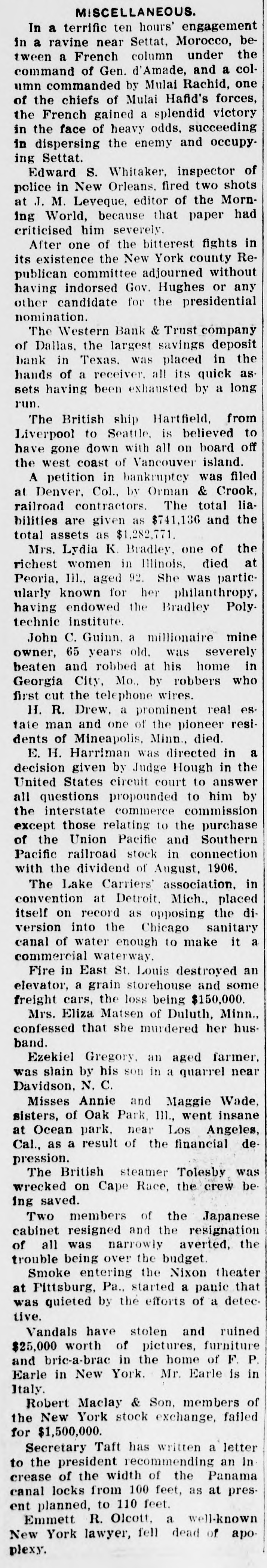 MISCELLANEOUS. In a terrific ten hours' engagement in a ravine near Settat, Morocco, between a French column under the command of Gen. d'Amade, and a column commanded by Mulai Rachid, one of the chiefs of Mulai Hafid's forces, the French gained a splendid victory in the face of heavy odds. succeeding in dispersing the enemy and occupying Settat. Edward S. Whitaker, inspector of police in New Orleans, fired two shots at J. M. Leveque, editor of the Morning World, because that paper had criticised him severely. After one of the bitterest fights in its existence the New York county Republican committee adjourned without having indorsed Gov. Hughes or any other candidate for the presidential nomination. The Western Bank & Trust company of Dallas, the largest savings deposit bank in Texas. was placed in the hands of a receiver. all its quick assets having been exhausted by a long run. The British ship Hartfield, from Liverpool to Seattle. is believed to have gone down with all on board off the west coast of Vancouver island. A petition in bankruptey was filed at Denver, Col., by Orman & Crook, railroad contractors. The total liabilities are given as $741,136 and the total assets as $1,282,771. Mrs. Lydia K. Bradley, one of the richest women in Illinois, died at Peoria, III., aged 92. She was particularly known for her philanthropy. having endowed the Bradley Polytechnic institute. John C. Guinn. a millionaire mine owner, 65 years old. was severely beaten and robbed at his home in Georgia City, Mo., by robbers who first cut the telephone wires. H. R. Drew, a prominent real estate man and one of the pioneer residents of Mineapolis, Minn., died. E. H. Harriman was directed in a decision given by Judge Hough in the United States circuit court to answer all questions propounded to him by the interstate commerce commission except those relating to the purchase of the Union Pacific and Southern Pacific railroad stock in connection with the dividend of August, 1906. The Lake Carriers' association, in convention at Detroit, Mich., placed itself on record as opposing the diversion into the Chicago sanitary canal of water enough to make it a commercial waterway. Fire in East St. Louis destroyed an elevator, a grain storehouse and some freight cars, the loss being $150,000. Mrs. Eliza Matsen of Duluth, Minn., confessed that she murdered her husband. Ezekiel Gregory. an aged farmer. was slain by his son in a quarrel near Davidson, N. C. Misses Annie and Maggie Wade, sisters, of Oak Park, III., went insane at Ocean park, near Los Angeles, Cal., as a result of the financial de. pression. The British steamer Tolesby was wrecked on Cape Race, the crew be. ing saved. Two members of the Japanese cabinet resigned and the resignation of all was narrowly averted, the trouble being over the budget. Smoke entering the Nixon theater at Pittsburg, Pa., started a panic that was quieted by the efforts of a detective. Vandals have stolen and ruined $25,000 worth of pictures, furniture and bric-a-brac in the home of F. P. Earle in New York. Mr. Earle is in Italy. Robert Maclay & Son, members of the New York stock exchange, failed for $1,500,000. Secretary Taft has written a letter to the president recommending an in crease of the width of the Panama canal locks from 100 feet, as at present planned, to 110 feet. Emmett R. Olcott, a well-known