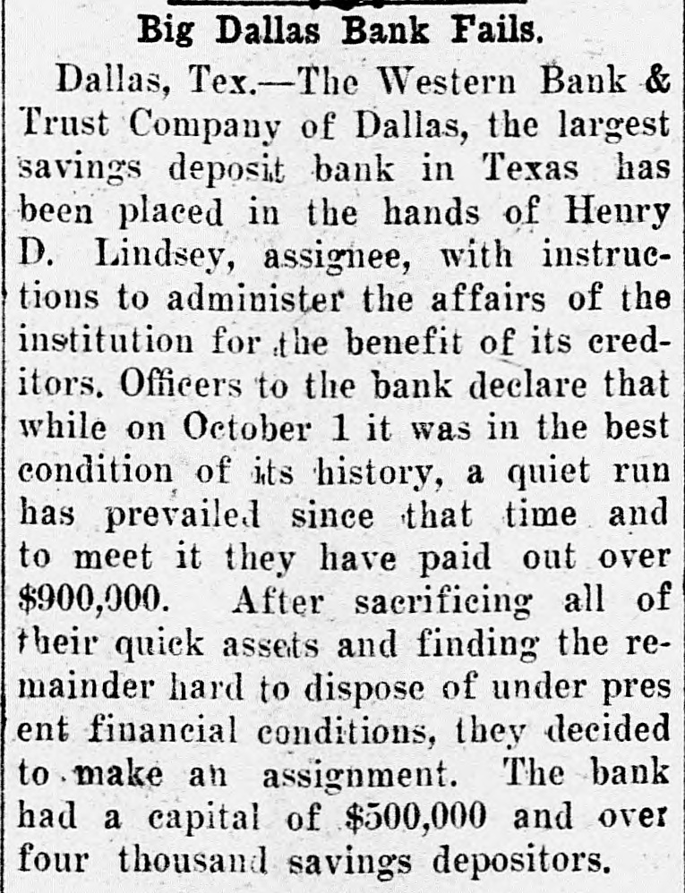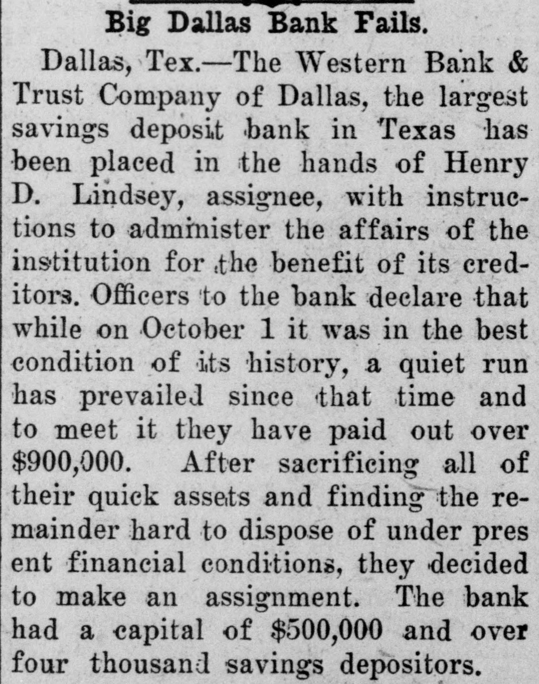 Big Dallas Bank Fails. Dallas, Tex.-The Western Bank & Trust Company of Dallas, the largest savings deposit bank in Texas has been placed in the hands of Henry D. Lindsey, assignee, with instructions to administer the affairs of the institution for the benefit of its creditors. Officers to the bank declare that while on October 1 it was in the best condition of its history, a quiet run has prevailed since that time and to meet it they have paid out over $900,000. After sacrificing all of their quick assets and finding the remainder hard to dispose of under pres ent financial conditions, they decided to make an assignment. The bank had a capital of $500,000 and over four thousand savings depositors.