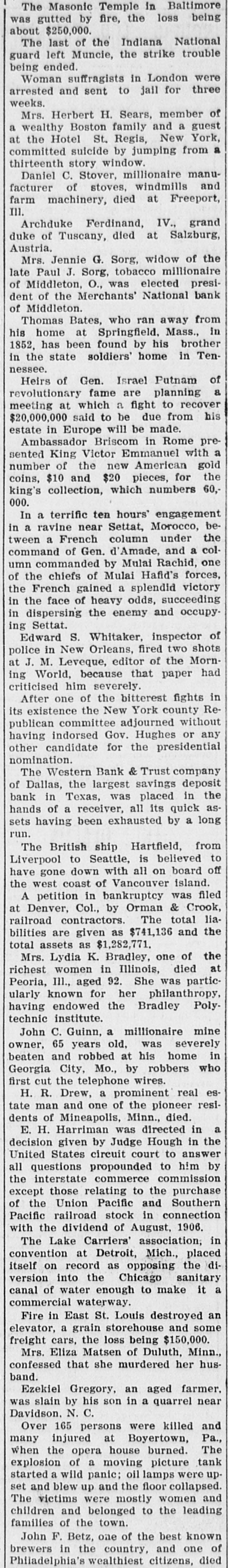 The Masonic Temple in Baltimore being was gutted by fire, the loss about $250,000. The last of the Indiana National guard left Muncie, the strike trouble being ended. Woman suffragists in London three were arrested and sent to jail for weeks. Mrs. Herbert H. Sears, member guest of wealthy Boston family and a York, a the Hotel St. Regis, New from committed at suicide by jumping a thirteenth story window. Daniel C. Stover, millionaire manu- and of stoves, windmills facturer farm machinery, died at Freeport, III. Archduke Ferdinand, IV., grand duke of Tuscany, died at Salzburg, Austria. Jennie G. Sorg, widow of the Mrs. Paul J. Sorg, tobacco millionaire late Middleton, O., was elected presi- bank of dent of the Merchants' National of Middleton. Thomas Bates, who ran away from in home at Springfield, Mass., his has been found by his brother Tenin 1852, the state soldiers' home in nessee. Heirs of Gen. Israel Putnam of a revolutionary fame are planning meeting at which a fight to recover his $20,000,000 said to be due from estate in Europe will be made. Ambassador Briscom in Rome preKing Victor Emmanuel with gold a number sented of the new American the $10 and $20 pieces, for 60, king's coins, collection, which numbers 000. In a terrific ten hours' engagement beravine near Settat, Morocco, the in a a French column under coltween command of Gen. d'Amade, and a one commanded by Mulai Rachid, forces, umn the chiefs of Mulai Hafid's victory of French gained a splendid the the face of heavy odds, succeeding in in dispersing the enemy and occupy ing Settat. Edward S. Whitaker, inspector shots of in New Orleans, fired two Mornpolice J. M. Leveque, editor of the had ing at World, because that paper criticised him severely. one of the bitterest fights Re- in After existence the New York county its publican committee adjourned without any indorsed Gov. Hughes or having other candidate for the presidential nomination. The Western Bank & Trust company Dallas, the largest savings deposit the of in Texas, was placed in asbank of a receiver, all its quick long sets hands having been exhausted by a run. The British ship Hartfield, from to Liverpool to Seattle, is believed board off have gone down with all on island. the west coast of Vancouver A petition in bankruptcy was Crook, filed Denver, Col., by Orman & liaat contractors. The total the bilities railroad are given as $741,136 and total assets as $1,282,771. Mrs. Lydia K. Bradley, one of the at women in Illinois, died Peoria, richest Ill., aged 92. She was particknown for her philanthropy, Polyhaving ularly endowed the Bradley technic institute. John C. Guinn, a millionaire mine 65 years old, was severely in owner, and robbed at his home who beaten Georgia City, Mo., by robbers first cut the telephone wires. R. Drew, a prominent real resi- esH. man and one of the pioneer a dents tate of Mineapolis, Minn., died. H. Harriman was directed in E. given by Judge Hough in the United decision States circuit court to answer by all questions propounded commission to him interstate commerce the those relating to the Southern purchase except the Union Pacific and connection of Pacific railroad stock in 1906. with the dividend of August, The Lake Carriers' association; in at Detroit, Mich., placed diconvention on record as opposing the itself version into the Chicago sanitary it a canal of water enough to make commercial waterway. Fire in East St. Louis destroyed an a grain storehouse and some elevator, freight cars, the loss being $150,000. Eliza Matsen of Duluth, Minn., husconfessed Mrs. that she murdered her band. Ezekiel Gregory, an aged farmer. near was slain by his son in a quarrel Davidson. N. C. and 165 persons were killed Pa., Over injured at Boyertown, The many when the opera house burned. tank of a moving picture upstarted explosion a wild panic; oil lamps collapsed. were and blew up and the floor and set victims were mostly women leading children The and belonged to the families of the town. John F. Betz, one of the best known of in the country, and one died Philadelphia's brewers wealthiest citizens,