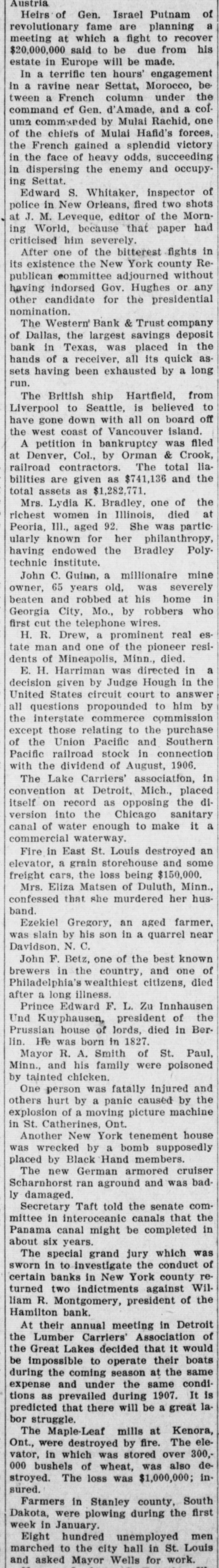 revolutionary fame are planning a meeting at which a fight to recover $20,000,000 said to be due from his estate in Europe will be made. In a terrific ten hours' engagement in a ravine near Settat, Morocco, between a French column under the command ef Gen. d'Amade, and a cofuma commanded by Mulai Rachid, one of the chiefs of Mulai Hafid's forces, the French gained a splendid victory in the face of heavy odds, succeeding in dispersing the enemy and occupying Settat. Edward S. Whitaker, inspector of police in New Orleans, fired two shots at J. M. Leveque, editor of the Morning World, because that paper had criticised him severely. After one of the bitterest fights in its existence the New York county Republican committee adjourned without having indorsed Gov. Hughes or any other candidate for the presidential nomination. The Western' Bank & Trust company of Dallas, the largest savings deposit bank in Texas, was placed in the hands of a receiver, all its quick assets having been exhausted by a long run. The British ship Hartfield, from Liverpool to Seattle, is believed to have gone down with all on board off the west coast of Vancouver island. A petition in bankruptcy was filed at Denver, Col., by Orman & Crook, railroad contractors. The total liabilities are given as $741,136 and the total assets as $1,282,771. Mrs. Lydia K. Bradley, one of the richest women in Illinois, died at Peoria, III., aged 92. She was particularly known for her philanthropy, having endowed the Bradley Polytechnic institute. John C. Guinn, a millionaire mine owner, 65 years old, was severely beaten and robbed at his home in Georgia City, Mo., by robbers who first cut the telephone wires. H. R. Drew, a prominent real estate man and one of the pioneer residents of Mineapolis, Minn., died. E. H. Harriman was directed in a decision given by Judge Hough in the United States circuit court to answer all questions propounded to him by the interstate commerce commission except those relating to the purchase of the Union Pacific and Southern Pacific railroad stock in connection with the dividend of August, 1906. The Lake Carriers' association, in convention at Detroit, Mich., placed itself on record as opposing the diversion into the Chicago sanitary canal of water enough to make it a commercial waterway. Fire in East St. Louis destroyed an elevator, a grain storehouse and some freight cars, the loss being $150,000. Mrs. Eliza Matsen of Duluth, Minn., confessed that she murdered her husband. Ezekiel Gregory, an aged farmer, was slain by his son in a quarrel near Davidson. N. C. John F. Betz, one of the best known brewers in the country, and one of Philadelphia's wealthiest citizens, died after a long illness. Prince Edward F. L. Zu Innhausen Und Kuyphausen, president of the Prussian house of lords, died in Berlin. He was born in 1827. Mayor R. A. Smith of St. Paul, Minn., and his family were poisoned by tainted chicken. One person was fatally injured and others hurt by a panic caused by the explosion of a moving picture machine in St. Catherines, Ont. Another New York tenement house was wrecked by a bomb supposedly placed by Black Hand members. The new German armored cruiser Scharnhorst ran aground and was badly damaged. Secretary Taft told the senate committee in interoceanic canals that the Panama canal might be completed in about six years. The special grand jury which was sworn in to investigate the conduct of certain banks in New York county returned two indictments against William R. Montgomery, president of the Hamilton bank. At their annual meeting in Detroit the Lumber Carriers' Association of the Great Lakes decided that it would be impossible to operate their boats during the coming season at the same expense and under the same conditions as prevailed during 1907. It is predicted that there will be a great labor struggle. The Maple-Leaf mills at Kenora, Ont., were destroyed by fire. The elevator, in which was stored over 300,000 bushels of wheat, was also destroyed. The loss was $1,000,000; insured. Farmers in Stanley county South