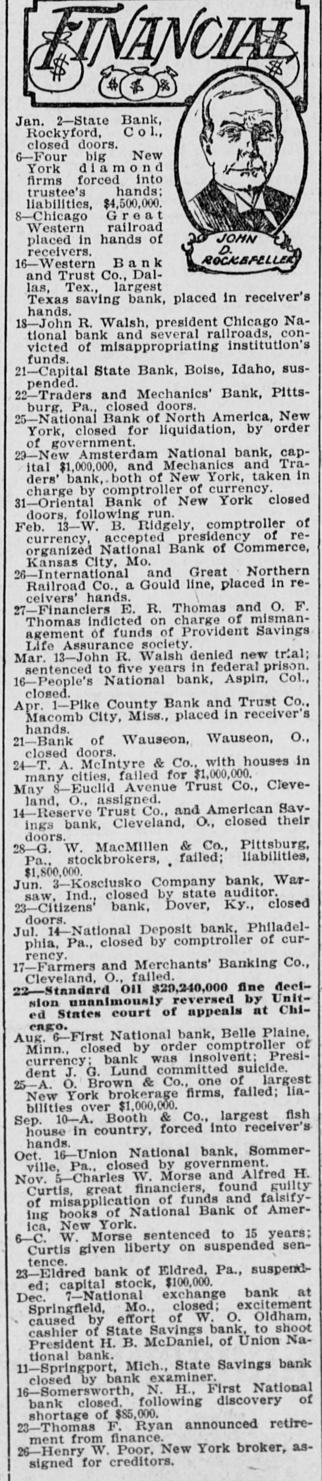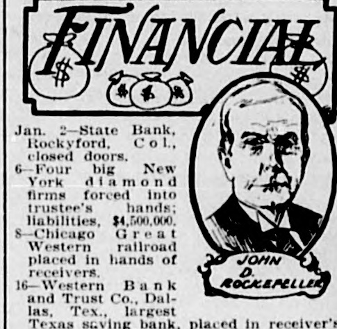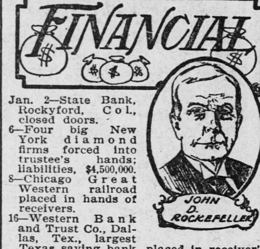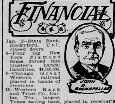 FINANCIAL COO Jan. 2-State Bank, Rockyford, Col., closed doors. &-Four big New York diamond firms forced into trustee's hands; liabilities, $4,500,000. 8-Chicago Great Western railroad JOHN placed in hands of D. receivers. ROCKEPELLER 16-Western Bank and Trust Co., Dallas, Tex., largest Texas saving bank, placed in receiver's