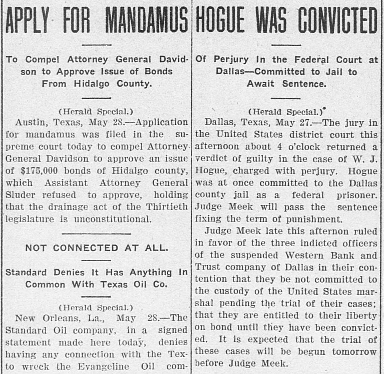 APPLY FOR MANDAMUS HOGUE WAS CONVICTED Of Perjury In the Federal Court at To Compel Attorney General DavidDallas-Committed to Jail to son to Approve Issue of Bonds Await Sentence. From Hidalgo County. (Herald Special.) (Herald Special.) Austin, Texas, May 28.-Application Dallas, Texas, May 27.-The jury in for mandamus was filed in the suthe United States district court this afternoon about 4 o'clock returned a preme court today to compel Attorney. General Davidson to approve an issue verdict of guilty in the case of W. J. of $175,000 bonds of Hidalgo county, Hogue, charged with perjury. Hogue was at once committed to the Dallas which Assistant Attorney General Sluder refused to approve, holding county jail as a federal prisoner. that the drainage act of the Thirtieth Judge Meek will pass the sentence legislature is unconstitutional. fixing the term of punishment. Judge Meek late this afternon ruled in favor of the three indicted officers NOT CONNECTED AT ALL. of the suspended Western Bank and Trust company of Dallas in their conStandard Denies It Has Anything In tention that they be not committed to Common With Texas Oil Co. the custody of the United States marshal pending the trial of their cases; (Herald Special.) that they are entitled to their liberty New Orleans, La., May 28.-The on bond until they have been convictStandard Oil company, in a signed ed. It is expected that the trial of statement made here today, denies these cases will be begun tomorrow having any connection with the Texbefore Judge Meek. to wreck the Evangeline Oil com-