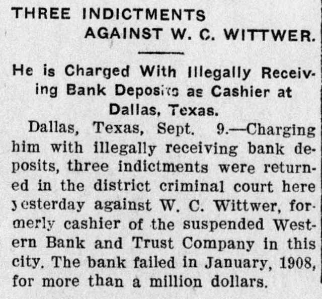 THREE INDICTMENTS AGAINST W. c. WITTWER. He is Charged With Illegally Receiving Bank Deposits as Cashier at Dallas, Texas. Dallas, Texas, Sept. 9.-Charging him with illegally receiving bank deposits, three indictments were returned in the district criminal court here J esterday against W. C. Wittwer, formerly cashier of the suspended Western Bank and Trust Company in this city. The bank failed in January, 1908, for more than a million dollars.