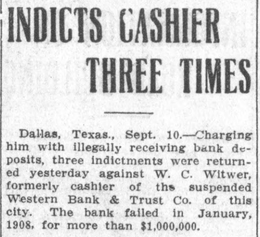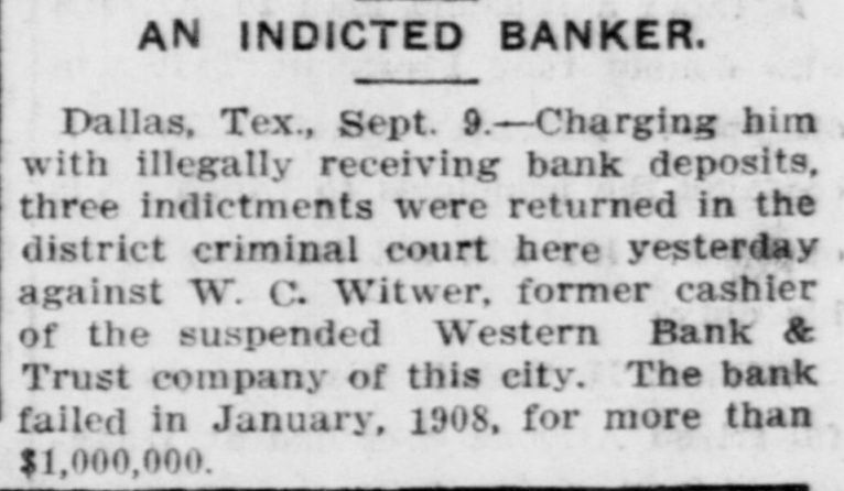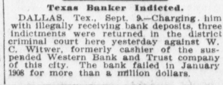 AN INDICTED BANKER. Dallas, Tex., Sept. 9.-Charging him with illegally receiving bank deposits, three indictments were returned in the district criminal court here yesterday against W. C. Witwer, former cashier of the suspended Western Bank & Trust company of this city. The bank failed in January, 1908, for more than $1,000,000.
