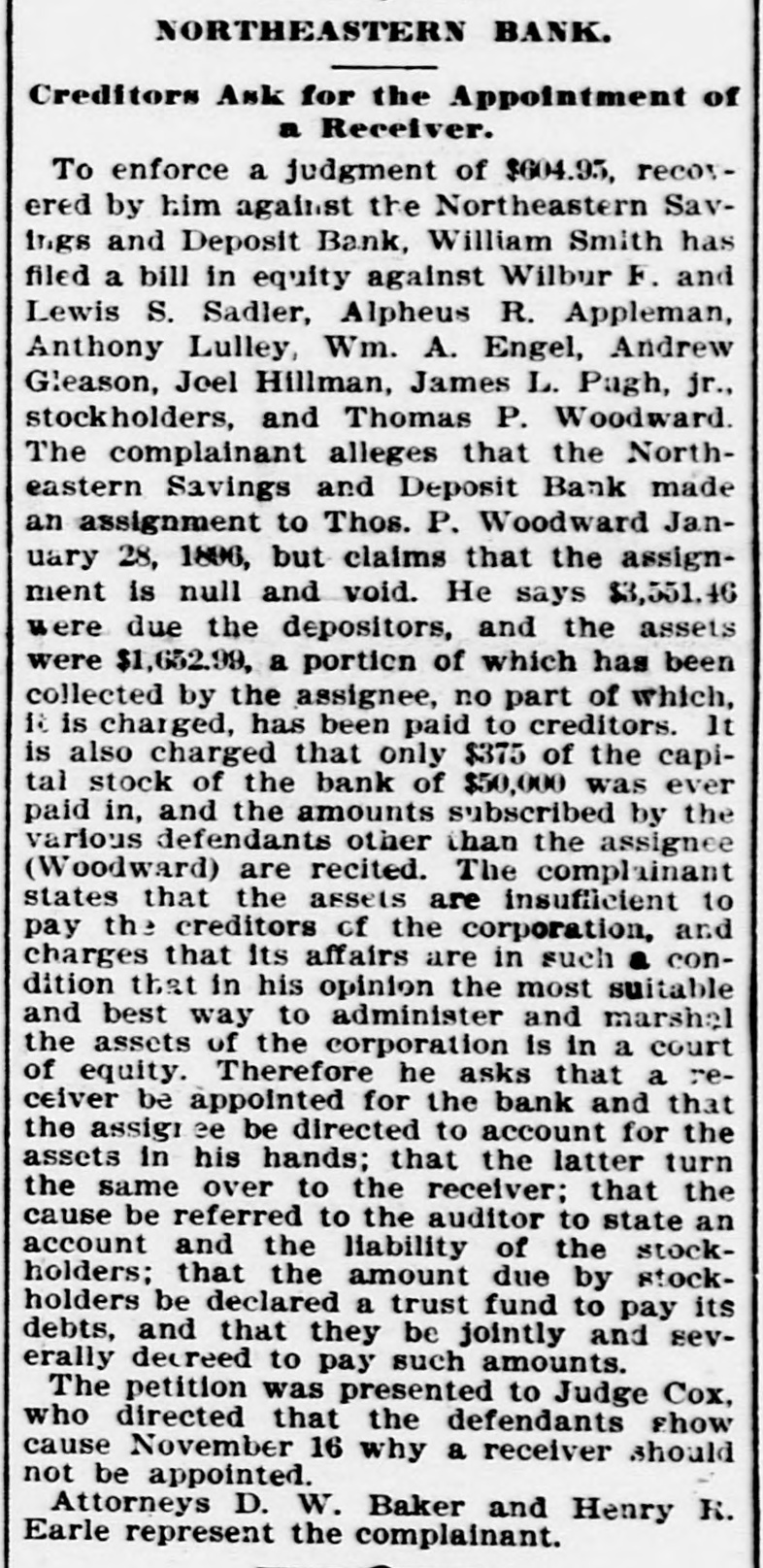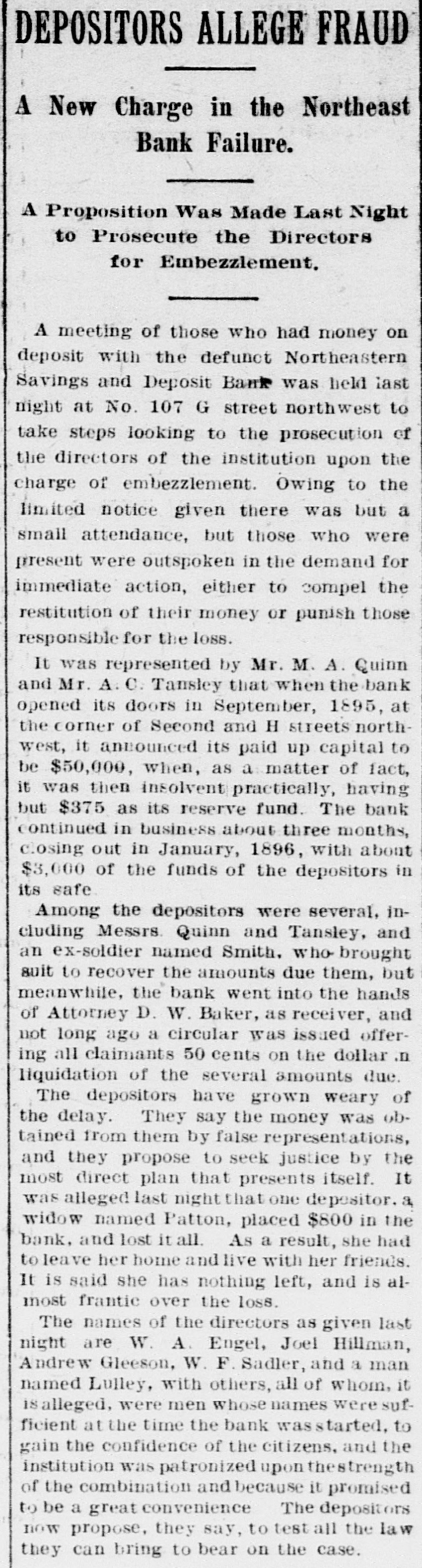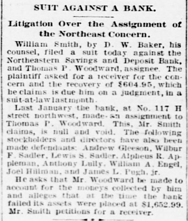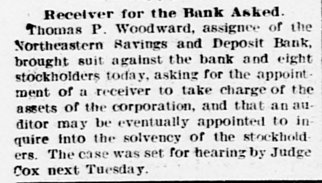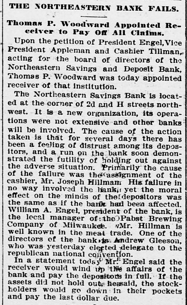 THE NORTHEASTERN BANK FAILS. Thomas P. Woodward Appointed Receiver to Pay Off All Claims. Upon the petition of President Engel, Vice President Appleman and Cashier Tillman, acting for the board of directors of the Northeastern Savings and Deposit Bank, Thomas P. Woodward was today appointed receiver of that institution. The Northeastern Savings Bank is located at the corner of 2d and H streets northwest. It is a new organization, its operations were not extensive and other banks will be involved. The cause of the action taken is that for several days there has been a feeling of distrust among its depositors, and a run on the bank soon demonstrated the futility of holding out against the adverse situation. Primarily the cause of the failure was the(assignment of the cashier, Mr. Joseph Hillmans His failure in no way involved the banki yet the moral effect on the minds of the/depositors was the same as if the bank had been affected. William A. Engel, president of the bank, is the lecal manager of the Pabst Brewing Company of Milwaukee. wMr. Hillman is well known in the meat trade. One of the directors of the bank, is. Andrew Gleeson, who was yesterday elected delegate to the republican national convention. In a statement today Mr.6 Engel said the receiver would wind up the affairs of the bank and pay the depositors in full. If the assets did not hold out. heasaid, the stockholders would go down : in their pockets and pay the last dollar due.