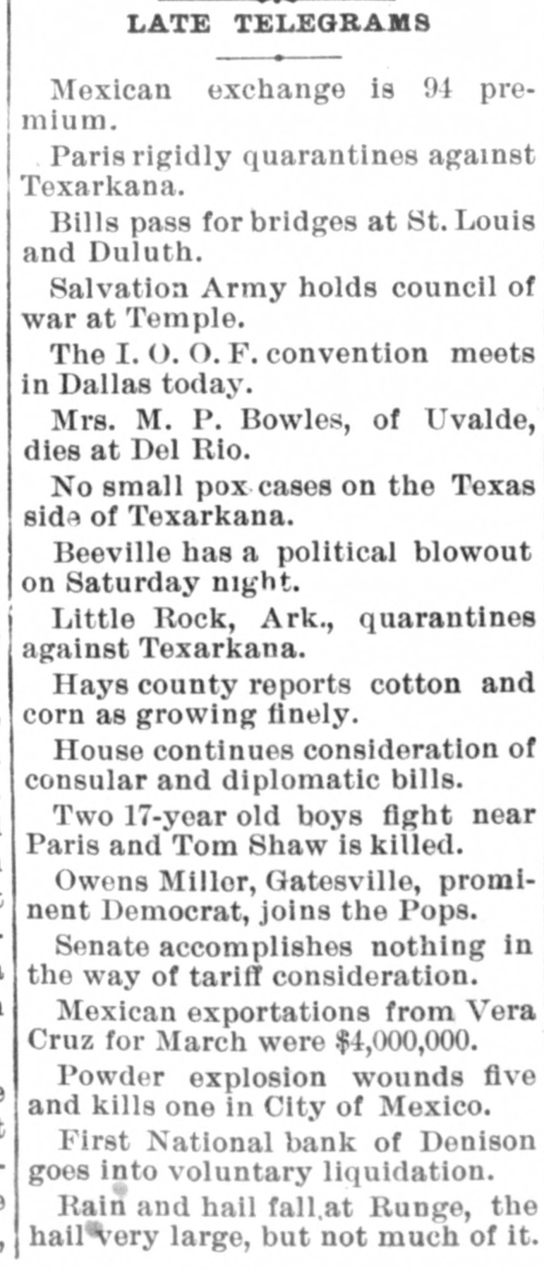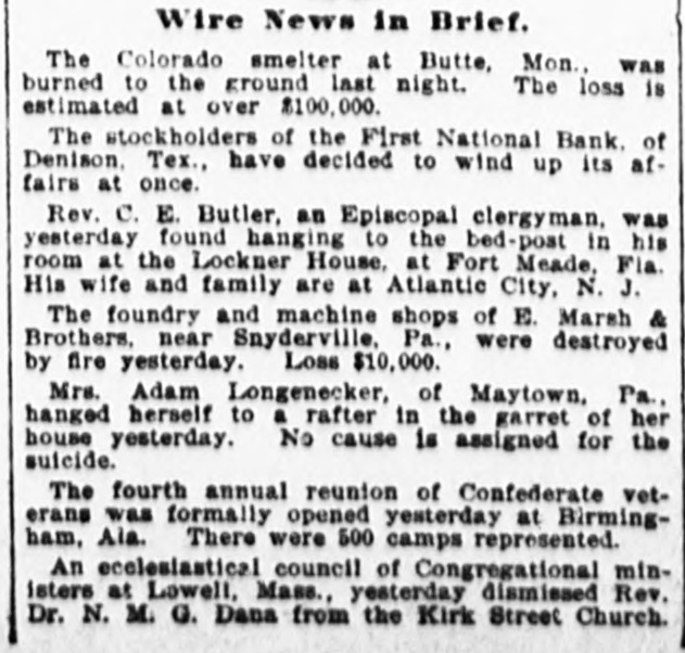 Wire News in Brief. The Colorado smelter at Butte, Mon., was burned to the ground last night. The loss is estimated at over $100,000. The stockholders of the First National Bank, of Denison, Tex., have decided to wind up its affairs at once. Rev. C. E. Butler, an Episcopal clergyman, was yesterday found hanging to the bed-post in his room at the Lockner House, at Fort Meade, Fla. His wife and family are at Atlantic City, N. J. The foundry and machine shops of E. Marsh & Brothers, near Snyderville, Pa., were destroyed by fire yesterday. Loss $10,000. Mrs. Adam Longenecker, of Maytown, Pa., hanged herself to a rafter in the garret of her house yesterday. No cause is assigned for the suicide. The fourth annual reunion of Confederate veterans was formally opened yesterday at Birmingham, Aia. There were 500 camps represented. An ecelesiastical council of Congregational ministers at Lowell, Mass., yesterday dismissed Rev. Dr. N. M. G. Dana from the Kirk Street Church.