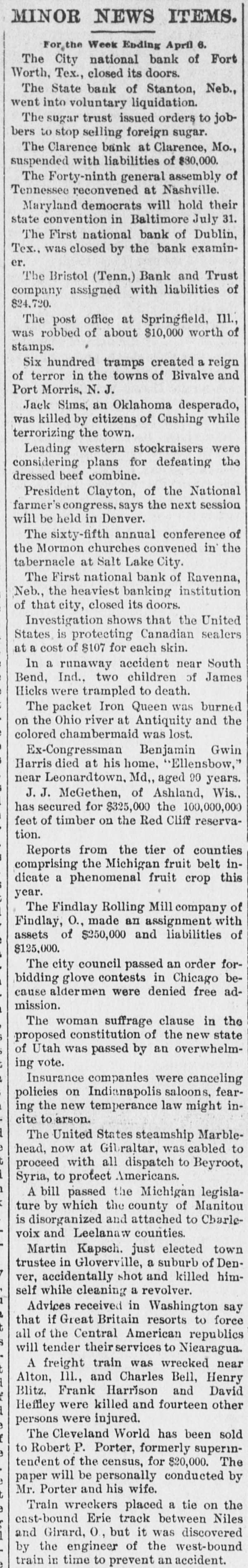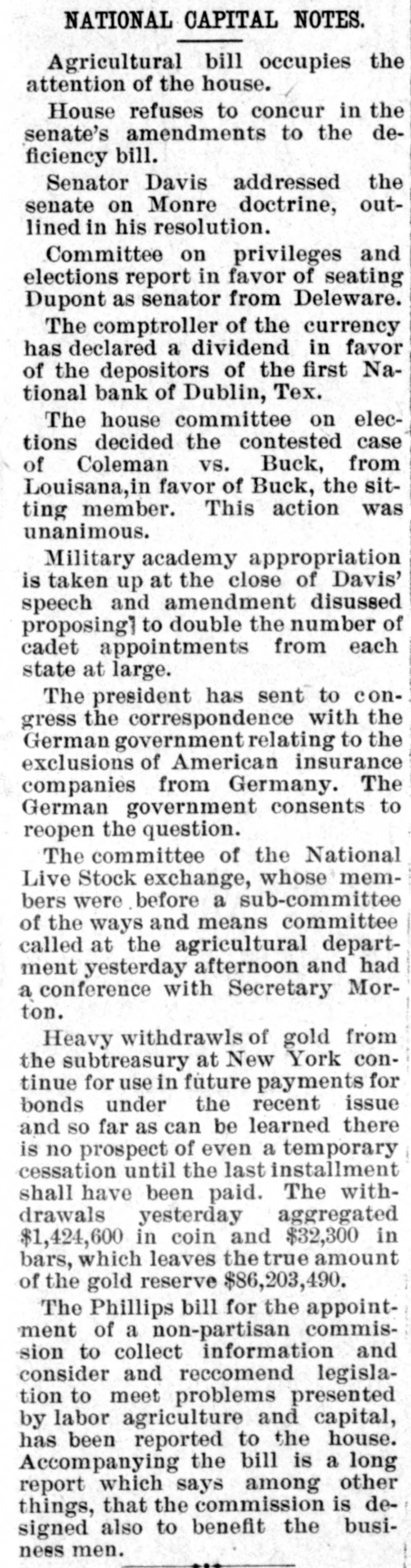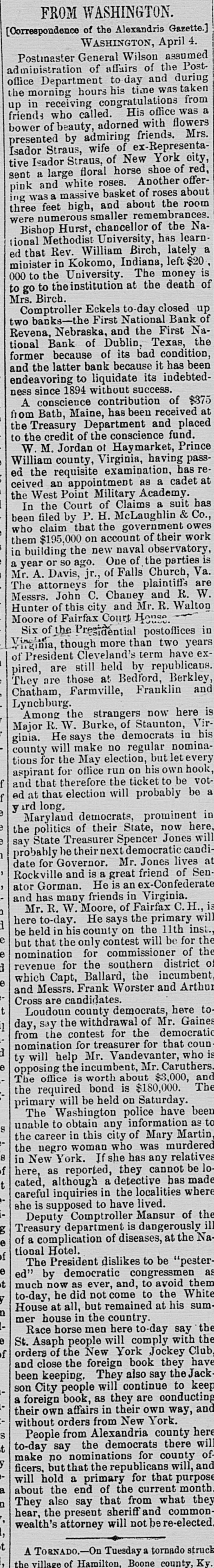 FROM WASHINGTON. [Correspondence of the Alexandris Gazett WASHINGTON, April 4. Postinaster General Wilson assume administration of affairs of the Pos office Department to day and durit the morning hours his time was take up in receiving congratulations fro friends who called. His office was bower of beauty, adorned with flowe presented by admiring friends. Mi Isador Straus, wife of ex-Represent tive Isador Straus, of New York oit sent a large floral horse shoe of re pink and white roses. Another offe ing was a massive basket of roses abo three feet high, and about the roo were numerous smaller remembrance Bishop Hurst, chancellor of the N tional Methodist University, has lear ed that Rev. William Birch, lately minister in Kokomo, Indiana, left $2 000 to the University. The money to go to theinstitution at the death Mrs. Birch. Comptroller Eckels to-day closed 1 two banks-the First National Bank Revena, Nebraska, and the First N tional Bank of Dublin, Texas, t former because of its bad conditio and the latter bank because it has be endeavoring to liquidate its indebte ness since 1894 without success. A conscience contribution of $3 from Bath, Maine, has been received the Treasury Department and plac to the credit of the conscience fund. W. M. Jordan of Haymarket, Prin William county, Virginia, having pa ed the requisite examination, has ceived an appointment as a cadet the West Point Military Academy. In the Court of Claims a suit h been filed by P. H. McLaughlin & C who claim that the government ow them $195,000 on account of their wo in building the new naval observator a year or SO ago. One of the parties Mr. A. Davis, jr., of Falls Church, \ The attorneys for the plaintiffs 8 Messrs. John C. Chaney and R. Hunter of this city and Mr. R. Walt Moore of Fairfax Court House. Six of the Presidential postoffices Virginia, though more than two ye of President Cleveland's term have e pired, are still held by republica They are those at Bedford, Berkle Chatham, Farmville, Franklin a Lynchburg. Among the strangers now here Major R. W. Burke, of Staunton, V ginia. He says the democrats in county will make no regular nomina tions for the May election, but let every aspirant for office run on his own ho and that therefore the ticket to be V ed at that election will probably be y ard long. Maryland democrats, prominent the politics of their State, now he say State Treasurer Spencer Jones via probably be their next democratic can date for Governor. Mr. Jones lives Rockville and is a great friend of S ator Gorman. He is an ex-Confeder and has many friends in Virginia. Mr. R. W. Moore, of Fairfax C. H. here to-day. He says the primary \ be held in his county on the 11th in but that the only contest will be for nomination for commissioner of revenue for the southern district which Capt, Ballard, the incumbe and Messrs. Frank Worster and Art Cross are candidates. Loudoun county democrats, here day, say the withdrawal of Mr. Gai from the contest for the democra nomination for treasurer for that CO ty will help Mr. Vandevanter, who opposing the incumbent, Mr. Caruth The office is worth about $3,000, a the required bond is $180,000. ] primary will be held on Saturday. The Washington police have b unable to obtain any information as S the career in this city of Mary Mar the negro woman who was murde 8 in New York. If she has any relati If here, as reported, they cannot be cated, although a detective has m: careful inquiries in the localities wh she is supposed to have lived. Deputy Comptroller Mansur of Treasury department is dangerously of a complication of diseases, at the ] tional Hotel. of The President dislikes to be "pest ed" by democratic congressmen much now as ever, and, to avoid th TITL