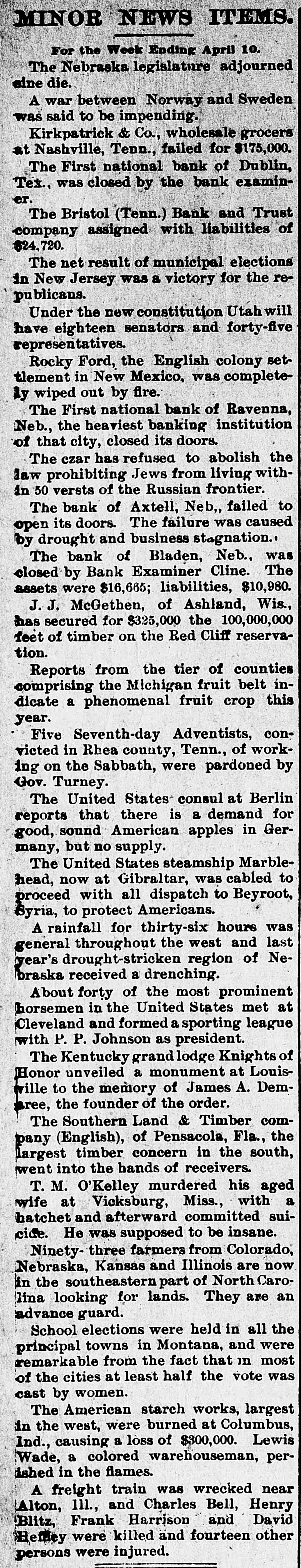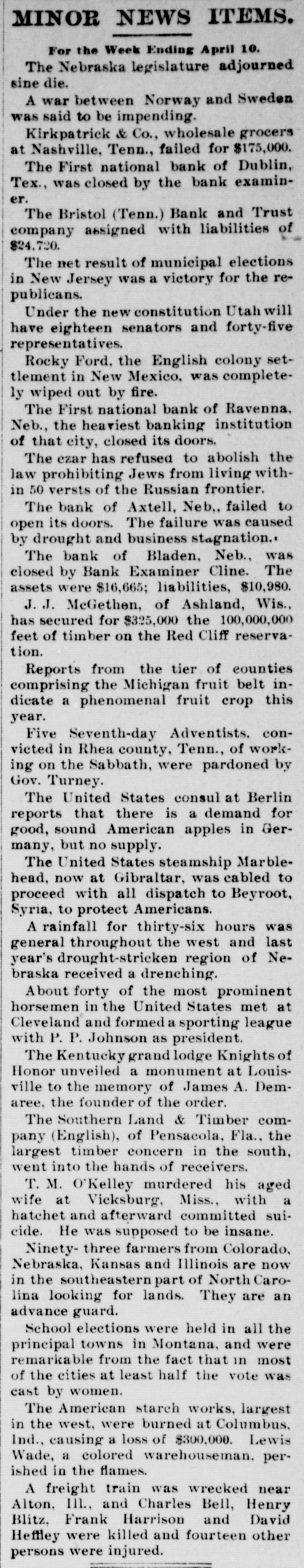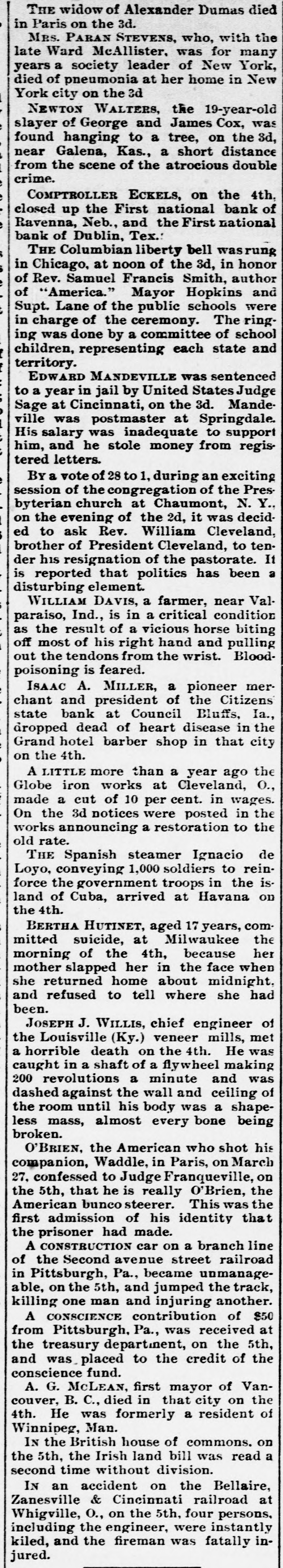 FROM WASHINGTON. [Correspondence of the Alexandris Gazett WASHINGTON, April 4. Postinaster General Wilson assume administration of affairs of the Pos office Department to day and durit the morning hours his time was take up in receiving congratulations fro friends who called. His office was bower of beauty, adorned with flowe presented by admiring friends. Mi Isador Straus, wife of ex-Represent tive Isador Straus, of New York oit sent a large floral horse shoe of re pink and white roses. Another offe ing was a massive basket of roses abo three feet high, and about the roo were numerous smaller remembrance Bishop Hurst, chancellor of the N tional Methodist University, has lear ed that Rev. William Birch, lately minister in Kokomo, Indiana, left $2 000 to the University. The money to go to theinstitution at the death Mrs. Birch. Comptroller Eckels to-day closed 1 two banks-the First National Bank Revena, Nebraska, and the First N tional Bank of Dublin, Texas, t former because of its bad conditio and the latter bank because it has be endeavoring to liquidate its indebte ness since 1894 without success. A conscience contribution of $3 from Bath, Maine, has been received the Treasury Department and plac to the credit of the conscience fund. W. M. Jordan of Haymarket, Prin William county, Virginia, having pa ed the requisite examination, has ceived an appointment as a cadet the West Point Military Academy. In the Court of Claims a suit h been filed by P. H. McLaughlin & C who claim that the government ow them $195,000 on account of their wo in building the new naval observator a year or SO ago. One of the parties Mr. A. Davis, jr., of Falls Church, \ The attorneys for the plaintiffs 8 Messrs. John C. Chaney and R. Hunter of this city and Mr. R. Walt Moore of Fairfax Court House. Six of the Presidential postoffices Virginia, though more than two ye of President Cleveland's term have e pired, are still held by republica They are those at Bedford, Berkle Chatham, Farmville, Franklin a Lynchburg. Among the strangers now here Major R. W. Burke, of Staunton, V ginia. He says the democrats in county will make no regular nomina tions for the May election, but let every aspirant for office run on his own ho and that therefore the ticket to be V ed at that election will probably be y ard long. Maryland democrats, prominent the politics of their State, now he say State Treasurer Spencer Jones via probably be their next democratic can date for Governor. Mr. Jones lives Rockville and is a great friend of S ator Gorman. He is an ex-Confeder and has many friends in Virginia. Mr. R. W. Moore, of Fairfax C. H. here to-day. He says the primary \ be held in his county on the 11th in but that the only contest will be for nomination for commissioner of revenue for the southern district which Capt, Ballard, the incumbe and Messrs. Frank Worster and Art Cross are candidates. Loudoun county democrats, here day, say the withdrawal of Mr. Gai from the contest for the democra nomination for treasurer for that CO ty will help Mr. Vandevanter, who opposing the incumbent, Mr. Caruth The office is worth about $3,000, a the required bond is $180,000. ] primary will be held on Saturday. The Washington police have b unable to obtain any information as S the career in this city of Mary Mar the negro woman who was murde 8 in New York. If she has any relati If here, as reported, they cannot be cated, although a detective has m: careful inquiries in the localities wh she is supposed to have lived. Deputy Comptroller Mansur of Treasury department is dangerously of a complication of diseases, at the ] tional Hotel. of The President dislikes to be "pest ed" by democratic congressmen much now as ever, and, to avoid th TITL