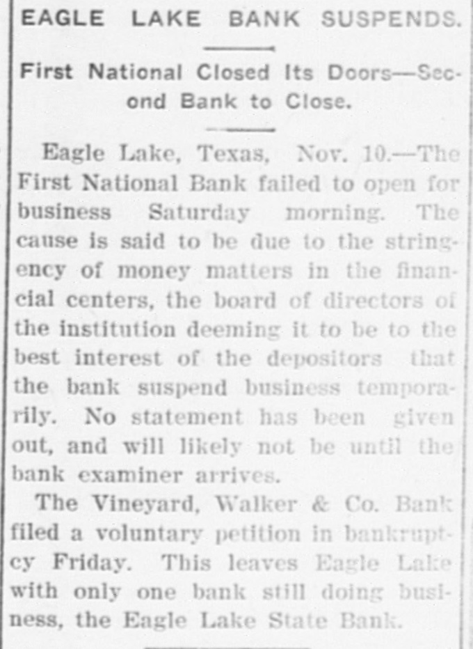EAGLE LAKE BANK SUSPENDS. First National Closed Its Doors-Second Bank to Close. Eagle Lake, Texas, Nov. 10.-The First National Bank failed to open for business Saturday morning. The cause is said to be due to the stringency of money matters in the financial centers, the board of directors of the institution deeming it to be to the best interest of the depositors that the bank suspend business temporarily. No statement has been given out, and will likely not be until the bank examiner arrives. The Vineyard, Walker & Co. Bank filed a voluntary petition in bankruptcy Friday. This leaves Eagle Lake with only one bank still doing business, the Eagle Lake State Bank.