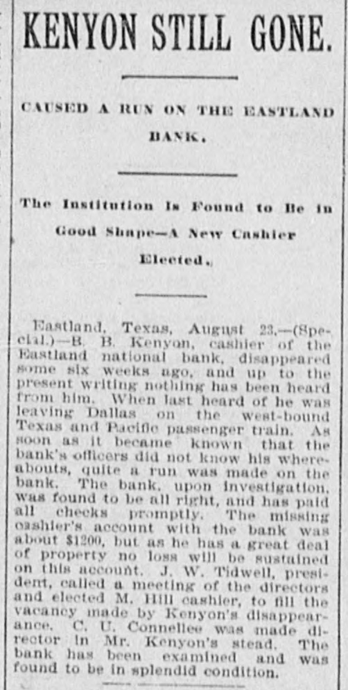 KENYON STILL GONE. CAUSED A RUN ON THE EASTLAND BANK. The Institution IN Found to Be in Good Shape-A New Cashier Elected. Eastland, Texas, August 23,-(Speclal.)-B. B. Kenyon, cashier of the Eastland national bank, disappeared some six weeks ngo, and up to the present writing nothing has been heard from him. When last heard of he was leaving Dallas on the west-bound Texas and Pacific passenger train. As soon as it became known that the bank's officers did not know his whereabouts, quite a run was made on the bank. The bank. upon investigation. was found to be all right, and has paid all checks promptly. The missing cashier's account with the bank was about $1200, but as he has a great deal of property no loss will be sustained on this account. J. W. Tidwell, president, called a meeting of the directors and elected M. Hill cashier, to fill the vacancy made by Kenyon's disappearance. C. U. Connellee was made director In Mr. Kenyon's stead. The bank has been examined and was found to be in splendid condition.