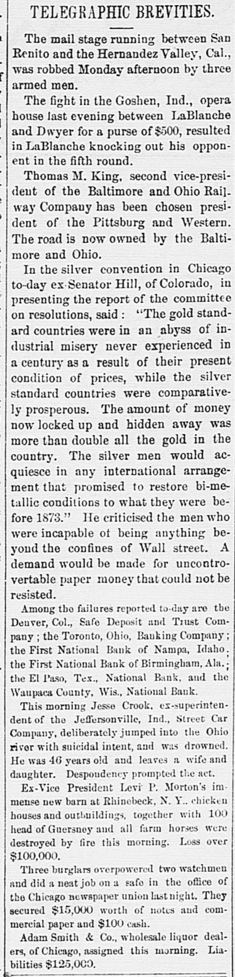 TELEGRAPHIC BREVITIES. The mail stage running between San Renito and the Hernandez Valley, Cal., was robbed Monday afternoon by three armed men. The fight in the Goshen, Ind., opera house last evening between LaBlanche and Dwyer for a purse of $500, resulted in LaBlanche knocking out his opponent in the fifth round. Thomas M. King, second vice-president of the Baltimore and Ohio Rai]way Company has been chosen president of the Pittsburg and Western. The road is now owned by the Baltimore and Ohio. In the silver convention in Chicago to-day ex-Senator Hill, of Colorado, in presenting the report of the committee on resolutions, said "The gold standard countries were in an abyss of industrial misery never experienced in a century as a result of their present condition of prices, while the silver standard countries were comparatively prosperous. The amount of money now locked up and hidden away was more than double all the gold in the country. The silver men would acquiesce in any international arrangement that promised to restore bi-metallic conditions to what they were before 1873." He criticised the men who were incapable of being anything beyond the confines of Wall street. A demand would be made for uncontrovertable paper money that could not be resisted. Among the failures reported to-day are the Denver, Col., Safe Deposit and Trust Company ; the Toronto, Ohio, Banking Company ; the First National Bank of Nampa, Idaho. the First National Bank of Birmingham, Ala. the El Paso, Tex., National Bank, and the Waupaca County, Wis., National Bank. This morning Jesse Crook. ex-superintendent of the Jeffersonville, Ind., Street Car Company, deliberately jumped into the Ohio river with suicidal intent, and was drowned. He was 46 years old and leaves a wife and daughter. Despondency prompted the act. Ex-Vice President Levi P. Morton's immense new barn at Rhinebeck, N.Y.. chicken houses and outbuildings, together with 100 head of Guersney and all farm horses were destroyed by fire this morning. Loss over $100,000. Three burglars overpowered two watchmen and did a neat job on a safe in the office of the Chicago newspaper union lastnight. They secured $15,000 worth of notes and commercial paper and $100 cash. Adam Smith & Co., wholesale liquor dealers, of Chicago, assigned this morning. Liabilities $125,000.