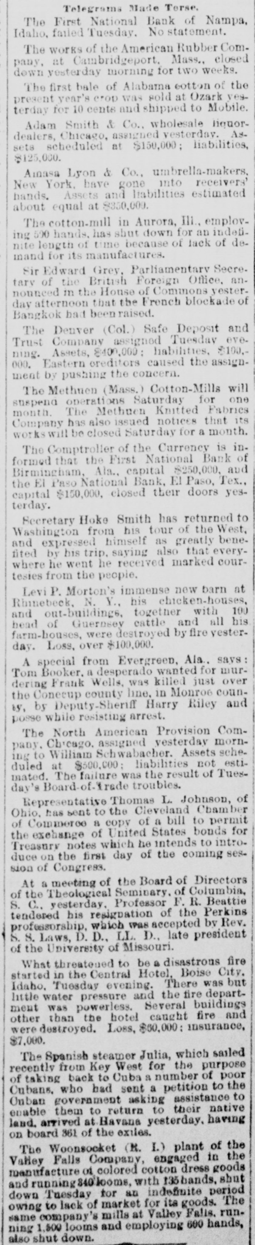 Telegrams Made Terse. The First National Bank of Nampa, Idaho, failed Tuesday. No statement. The works of the American Rubber Company, at Cambridgeport. Mass., closed down yesterday morning for two weeks. The first bale of Alabama cotton of the present year's CTOD was sold at Ozark yesterday for 10 cents and shipped to Mobile. Adam Smith & Co., wholesale liquordealers, Chicago, assigned vesterday. Assets scheduled at $150,000; liabilities, $125,000. Ainasa Lyon & Co., umbrella-makers, New York, have gone into receivers' hands. Assets and liabilities estimated about equal at $350,000. The cotton-mill in Aurora, III., employing 590 hands, has shut down for an indefinite length of time because of lack of demand for its manufactures. Sir Edward Grey, Parliamentary Secre. tary of the British Foreign Office. announced in the House of Commons yesterday afternoon that the French blockade of Bangkok bad been raised. The Denver (Col.) Safe Deposit and Trust Company assigned Tuesday evening. Assets, 8400.000: liabilities, $100.000. Eastern oreditors caused the assignment by pushing the concern. The Methuen (Mass.) Cotton-Mills will suspend operations Saturday for one month. The Methuen Knitted Fabrics Company has also issued notices that its workswill be closed Saturday for a month. The Comptroller of the Currency is informed that the First National Bank of Birmingham, Ala., capital $250,000. and the El Paso National Bank, El Paso, Tex., capital $150,000, closed their doors yesterday. Secretary Hoke Smith has returned to Washington from his tour of the West, and expressed himself as greatly benefited by his trip. saying also that everywhere he went he received marked courtesies from the people. Levi P. Morton's immense now barn at Rhmebeek, N. ¥., his chicken-houses, and out-buildings, together with 100 head of Guernsey cattle and all his farm-houses, were destroyed by fire yesterday. Loss, over $100,000. A special from Evergreen, Ala. says: Tom Booker. a desperado wanted for murdering Frank Wells, was killed just over the Conecup county line, in Monroe counby, by Deputy-Sherif Harry Riley and posse while resisting arrest. The North American Provision Company. Chicago, assigned yesterday morning to William Schwabacher. Assets scheduled at $500,000; liabilities not estimated. The failure was the result of Tuesday's Board-of-Xrade troubles. Representative Thomas L. Johnson, of Ohio, has sent to the Cleveland Chamber of Commerce a copy of a bill to permit the exchange of United States bonds for Treasury notes which he intends to introduce on the first day of the coming session of Congress. At a meeting of the Board of Directors of the Theological Seminary. of Columbia, S. C., yesterday. Professor F. R. Beattie tendered his resignation of the Perkins professorship, which was accepted by Rev. S. 8. Laws, D. D., LL. D., late president of the University of Missouri. What threateued to be a disastrous fire started in the Central Hotel, Boise City. Idaho. Tuesday evening. There was but little water pressure and the fire department was powerless. Several buildings other than the hotel caught fire and were destroyed. Loss, $50,000: insurance, $7,000. The Spanish steamer Julia, which sailed recently from Key West for the purpose of taking back to Cuba a number of poor Cubans, who had sent a petition to the Ouban government asking assistance to enable them to return to their native land. arrived at Havana yesterday. having on board 361 of the exiles. The Woonsocket (R. I.) plant of the Valley Falls Company, engaged in the manufacture of colored cotton dress goods and running84@looms, with 135 bands, shut for an lack of market for owing down Tuesday to indefruite its goods. period The same company's mills at Valley Falls. running 1,500 looms and employing 600 hands, also shut down.