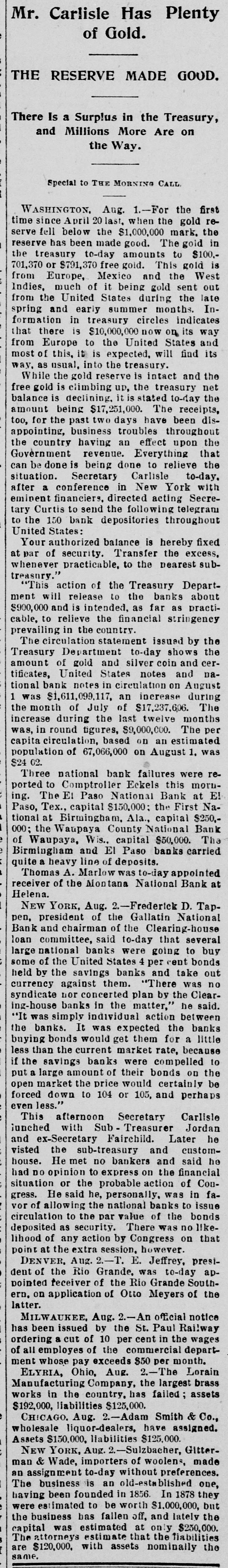 Mr. Carlisle Has Plenty of Gold. THE RESERVE MADE GOOD. There Is a Surplus in the Treasury, and Millions More Are on the Way. Special to THE MORNING CALL WASHINGTON, Aug. 1.-For the first time since April 20 last, when the gold reserve fell below the $1,000,000 mark. the reserve in amounts or is 701,370 the treasury has $791,370 been to-day made free gold. good. This The to gold gold $100,from Europe, Mexico and the West Indies, much of it being gold sent out from the United States during the late spring and early summer months. Information in treasury circles indicates that there is $10,000,000 now on its way from Europe to the United States and most of this, it is expected, will find its way, as usual, into the treasury. While the gold reserve is intact and the free gold is climbing up, the treasury net balance is declining, it is stated to-day the amount being $17,251,000. The receipts, too, for the past two days have been disappointing, business troubles throughout the country having an effect upon the Government revenue. Everything that situation. after can be a done conference Secretary being done in Carlisle New to relieve York to-day. with the eminent financiers, directed acting Secretary Curtis to send the following telegram to the 150 bank depositories throughout United States: Your authorized balance is hereby fixed at par of security. Transfer the excess. whenever practicable, to the nearest subtreasury." "This action of the Treasury Department will release to the banks about $900,000 and is intended, as far as practicable, to relieve the financial stringency prevailing in the country. The circulation statement issued by the Treasury Department to-day shows the amount of gold and silver coin and certificates, United States notes and national bank notes in circulation on August 1 was $1,611,099,117, an increase during the month of July of $17,237,606. The increase during the last twelve months was, in round tigures, $9,000,000. The per capita circulation, based on an estimated population of 67,066,000 on August 1. was $24 02. Three national bank failures were reported to Comptroller Eckels this morning. The E1 Paso National Bank at E! Paso, Tex., capital $150,000; the First National at Birmingham, Ala., capital $250,000; the Waupaya County National Bank of Waupaya, Wis., capital $50,000. The Birmingham and El Paso banks carried quite a heavy line of deposits. Thomas A. Marlow was to-day appointed receiver of the Montana National Bank at Helena. NEW YORK, Aug. 2.-Frederick D. Tappen, president of the Gallatin National Bank and chairman of the Clearing-house loan committee, said to-day that several large national banks were going to buy some of the United States 4 per cent bonds held by the savings banks and take out currency against them. "There was no syndicate nor concerted plan by the Clearing-house banks in the matter," he said. "It was simply individual action between the banks. It was expected the banks buying bonds would get them for a little less than the current market rate, because if the savings banks were compelled to put a large amount of their bonds on the open market the price would certainly be forced down to 104 or 105, and perhaps even less." This afternoon Secretary Carlisle junched with Sub Treasurer Jordan and ex-Secretary Fairchild. Later he visted the sub-treasury and customhouse. He met no bankers and said he had DO opinion to express on the financial situation or the probable action of Congress. He said he, personally, was in favor of allowing the national banks to issue circulation to the par value of the bonds deposited as security. There was no likelihood of any action by Congress on that point at the extra session. however. DENVER, Aug. 2.-T. E. Jeffrey, president of the Rio Grande, was to-day appointed receiver of the Rio Grande Southern. on application of Otto Meyers of the latter. MILWAUKEE, Aug. -An official notice has been issued by the St. Paul Railway ordering a cut of 10 per cent in the wages of all employes of the commercial department whose pay exceeds $50 per month. ELYRIA, Ohio, Aug. 2.-The Lorain Manufacturing Company, the largest brass works in the country. has failed; assets $192,000, liabilities $125,000. CHICAGO. Aug. 2.-Adam Smith & Co., wholesale liquor-dealers, have assigned. Assets $150,000. liabilities $125,000. NEW YORK, Aug. 2.-Sulzbacher, Gitterman & Wade, importers of woolens, made an assignment to-day without preferences. The business is an d-established one, having been founded in 1856. In 1878 they were estimated to be worth $1.000,000, but the business bas fallen off, and lately the capital was estimated at only $230,000. The attorneys estimate that the liabilities are $120,000. with assets nominally the same.