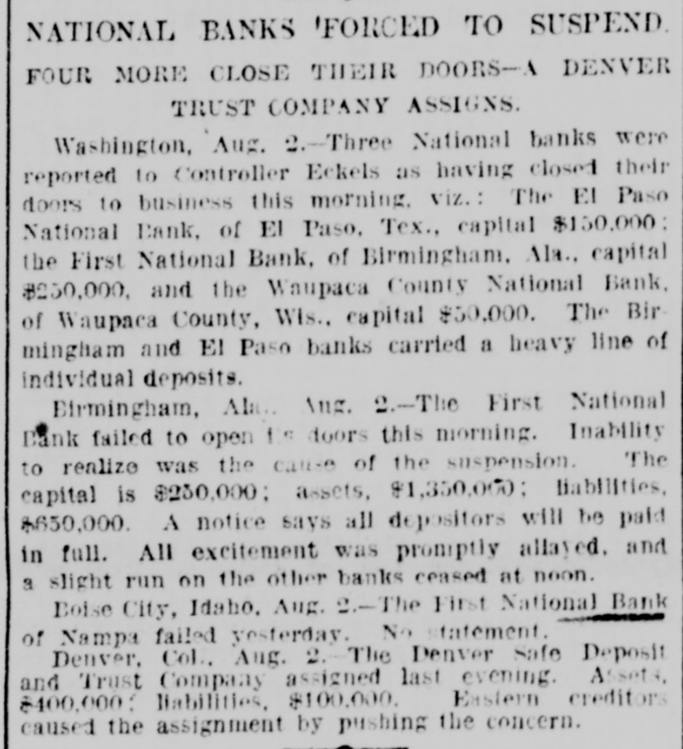NATIONAL BANKS 'FORCED TO SUSPEND FOUR MORE CLOSE THEIR DOORS-A DENVER TRUST COMPANY ASSIGNS. Washington, Aug. 2.-Three National banks were reported to Controller Eckels as having closed their doors to business this morning, viz.: The El Paso National Bank, of El Paso, Tex., capital $150,000: the First National Bank, of Birmingham. Ala., capital $250,000, and the Waupaca County National Bank, of Waupaca County, Wis., capital $50,000. The Birmingham and El Paso banks carried a heavy line of individual deposits. Birmingham, Ala. Aug. 2.-The First National Bank failed to open is doors this morning. Inability to realize was the cause of the suspension. The capital is $250,000: assets, $1,350,000; liabilities, $650,000. A notice says all depositors will be paid in full. All excitement was promptly allayed. and a slight run on the other banks ceased at noon. Boise City, Idaho. Aug. 2.-The First National Bank of Nampa failed yesterday. No statement. Denver, Col., Aug. 2.-The Denver Safe Deposit and Trust Company assigned last evening. Assets. $400,000: liabilities, $100,000. Eastern creditors caused the assignment by pushing the concern.