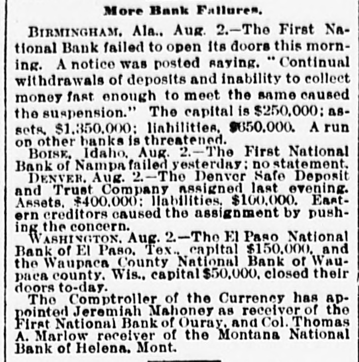 More Bank Failures. BIRMINGHAM. Ala., Aug. 2.-The First National Bank failed to open its doors this morning. A notice was posted saving. Continual withdrawals of deposits and inability to collect money fast enough to meet the same caused the suspension." The capital is $250,000: assets. $1,350,000: liabilities, $650,000. A run on other banks is threatened. BOISE, Idaho, Aug. 2.-The First National Bank of Nampa failed yesterday: no statement. DENVER. Aug. 2-The Denver Safe Deposit and Trust Company assigned last evening. Assets. $400,000: liabilities. $100,000. Eastern creditors caused the assignment by pushing the concern. WASHINGTON. Aug. 2-The El Paso National Bank of El Paso. Tex., capital $150,000. and the Waupaca County National Bank of Waupaca county. Wis., capital $50,000. closed their doors to-day. The Comptroller of the Currency has appointed Jeremiah Mahoney as receiver of the First National Bank of Ouray. and Col. Thomas A. Marlow receiver of the Montana National Bank of Helena. Mont.