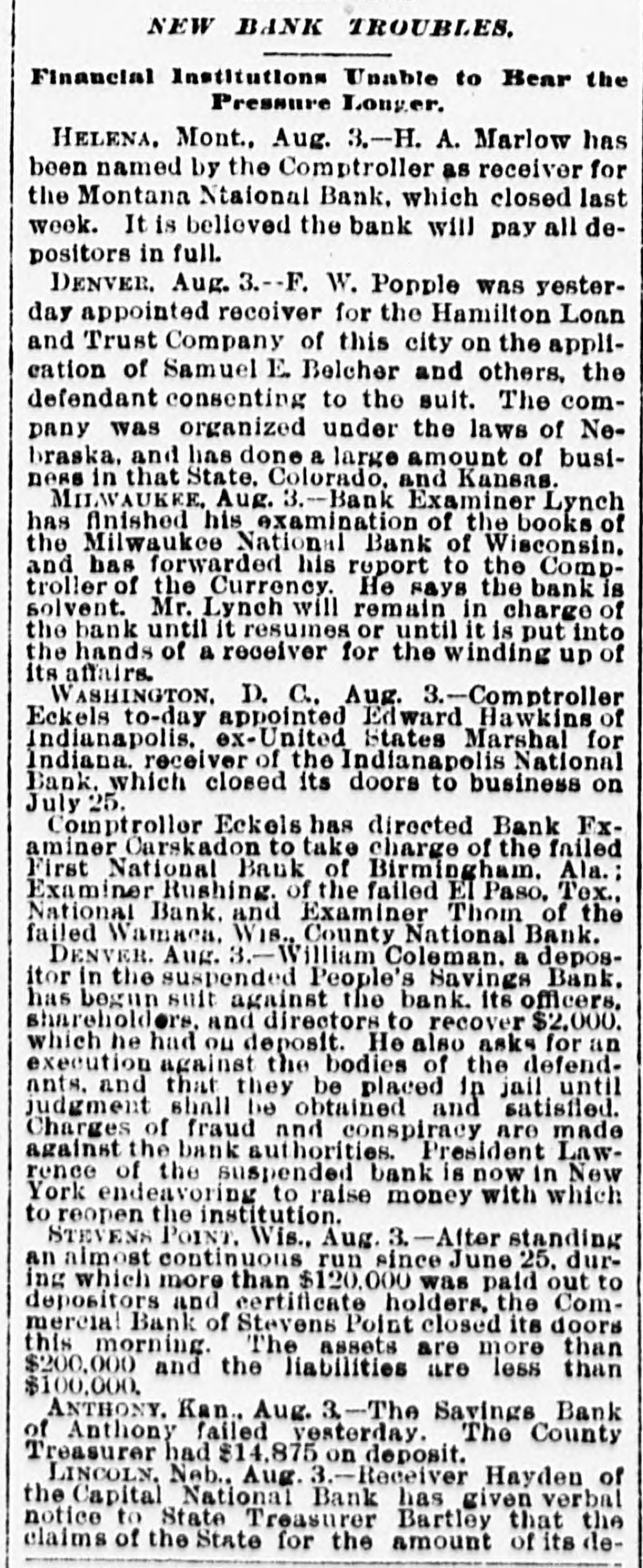 NEW BANK TROUBLES, Financial Institutions Unable to Bear the Pressure Longer. HELENA, Mont., Aug. 3.-H. A. Marlow has been named by the Comptroller as receiver for the Montana Ntaional Bank, which closed last week. It is believed the bank will pay all depositors in full. DENVER. Aug. 3.--F. W. Popple was yesterday appointed receiver for the Hamilton Loan and Trust Company of this city on the application of Samuel E. Belcher and others, the defendant consenting to the suit. The company was organized under the laws of Nebraska, and has done a large amount of business in that State. Colorado, and Kansas. MILWAUKE, Aug. 3.-Bank Examiner Lynch has finished his examination of the books of the Milwaukee National Bank of Wisconsin, and has forwarded his report to the Comptroller of the Currency. He says the bank is solvent. Mr. Lynch will remain in charge of the bank until it resumes or until it is put into the hands of a receiver for the winding up of its affairs. WASHINGTON, D. C., Aug. 3.-Comptroller Eckels to-day appointed Edward Hawkins of Indianapolis. ex-United States Marshal for Indiana. receiver of the Indianapolis National Bank. which closed its doors to business on July 25. Comptroller Eckels has directed Bank Examiner Carskadon to take charge of the failed First National Bank of Birmingham. Ala. Examiner Rushing. of the failed El Paso, Tex., National Bank. and Examiner Thom of the failed Wamaca. Wis., County National Bank. DENVER. Aug. 3.-William Coleman. a depositor in the suspended People's Savings Bank. has begun suit against the bank. its officers. shareholders. and directors to recover $2,000. which he had on deposit. He also asks for an execution against the bodies of the defendnnts. and that they be placed in jail until judgment shall be obtained and satisfied. Charges of fraud and conspiracy are made against the bank authorities. President Lawrence of the suspended bank is now in New York endeavoring to raise money with which to reopen the institution. STEVENS POINT. Wis., Aug. 3.-After standing an almost continuous run since June 25, during which more than $120.000 was paid out to depositors and certificate holders, the Commercial Bank of Stevens Point closed its doors this morning. The assets are more than $200,000 and the liabilities are less than $100,000. ANTHONY. Kan., Aug. 3.-The Savings Bank of Anthony failed vesterday. The County Treasurer had $14,875 on deposit. LINCOLN. Neb., Aug. 3.-Receiver Hayden of the Capital National Bank has given verbal notice to State Treasurer Bartley that the claims of the State for the amount of its de-