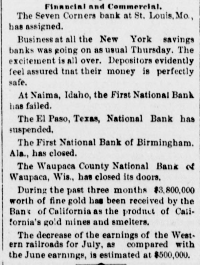 Financial and Commercial. The Seven Corners bank at St. Louis, Mo., has assigned. Business at all the New York savings banks was going on as usual Thursday. The excitement is all over. Depositors evidently feel assured tnat their money is perfectly safe. At Naima, Idaho, the First National Bank has failed. The El Paso, Texas, National Bank has suspended. The First National Bank of Birmingham. Ala., has closed. The Waupaca County National Bank of Waupaca, Wis., has closed its doors, During the past three months $3,800,000 worth of fine gold has been received by the Bank of California as the product of California's gold mines and smelters. The decrease of the earnings of the Western railroads for July, as compared with the June earnings, is estimated at $500,000.