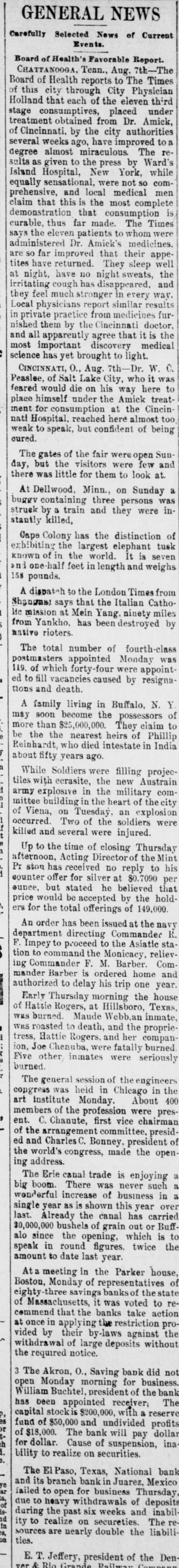 GENERAL NEWS Carefully Selected News of Current Events. Board of Health's Favorable Report. CHATTANOOGA, Tenn., Aug. 7th-The Board of Health reports to The Times of this city through City Physician Holland that each of the eleven third stage consumptives, placed under treatment obtained from Dr. Amick, of Cincinnati, by the city authorities several weeks ago, have improved to a degree almost miraculous. The results as given to the press by Ward's Island Hospital, New York, while equally sensational, were not so comprehensive, and local medical men claim that this is the most complete demonstration that consumption is curable, thus far made. The Times says the eleven patients to whom were administered Dr. Amick's medicines. are SO far improved that their appetites have returned. They sleep well at night, have no night sweats, the irritating cough has disappeared, and they feel much stronger in every way. Local physicians report similar results in private practice from medicines furnished them by the Cincinnati doctor, and all apparently agree that it is the most important discovery medical science has yet brought to light. CINCINNATI, O., Aug. 7th-Dr. W. C. Peaslee, of Salt Lake City, who it was feared would die on his way here to place himself under the Amick treatment for consumption at the Cincinnati Hospital, reached here almost too weak oured. to speak, but confident of being The gates of the fair open Sunday, but the visitors were few and there was little for them to look at. At Dellwood. Minn., on Sunday a buggy containing three persons was struck by a train and they were instantly killed, Cape Colony has the distinction of exhibiting the largest elephant tusk known of in the world. It is seven and one half feet in length and weighs 158 pounds. A dispatch to the London Times from Shangmai says that the Italian CathoИс mission at Mein Yang. ninety miles from Yankho, has been destroyed by native rioters. The total number of fourth-class postmasters appointed Monday was 119. of which forty-four were appointed to fill vacancies caused by resignations and death. A family living in Buffalo, N. Y may soon become the possessors of more than $25,000,000. They claim to be the the nearest heirs of Phillip Reinhardt, who died intestate in India about fifty years ago. While Soldiers were filling projectiles with ecrasite, the new Austrain army explosive in the military committee building in the heart of the city of Viena, on Tuesday, an explosion occurred. Two of the soldiers were killed and several were injured. Up to the time of closing Thursday afternoon, Acting Directorof the Mint Pr stop has received no reply to his counter offer for silver at $0.7090 per ounce, but stated he believed that price would be accepted by the holders for the total offerings of 149,000. An order has been issued at the navy department directing Commander R. F. Impey to proceed to the Asiatic station to command the Monicacy, relieving Commander F. M. Barber. Commander Barber is ordered home and authorized to delay his trip one year. Early Thursday morning the house of Hattie Rogers, at Hillsboro, Texas, was burned. Maude Webb,an inmate. was roasted to death, and the proprietress, Hattie Rogers, and her companion, Joe Chenuba, were fatally burned burned. Five other inmates were seriously The general session of the engineers congress was held in Chicago in the art institute Monday. About 400 members of the profession were present. C. Chanute, first vice chairman of the arrangement committee, presided and Charles C. Bonney, president of the world's congress, made the open ing address. The Erie canal trade is enjoying big boom. There was never such a a wonderful increase of business in a single year as is shown this year over last. Already the canal has carried $0,000,000 bushels of grain out or Buff alo since the opening, which is to speak in round figures, twice the amount to date last year. At a meeting in the Parker house, Boston, Monday of representatives of savings banks of the state of Massachusetts, it was voted to recommend that the banks take action at once in applying the restriction provided by their by-laws against the withdrawal of large deposits without the required notice. 3 The Akron, O., Saving bank did not open Monday morning for business. William Buchtel, president of the bank has been appointed receiver; The capital stockis $200,000, with a reserve fund of $50,000 and undivided profits of $18,000. The bank will pay dollar for dollar. Cause of suspension, inability to realize on securities. The El Paso, Texas, National bank and its branch bank in Juarez, Mexico failed to open for business Thursday due to heavy withdrawals of deposits during the past six weeks and inability to realize on secureties. The resources ties. are nearly double the liabili-