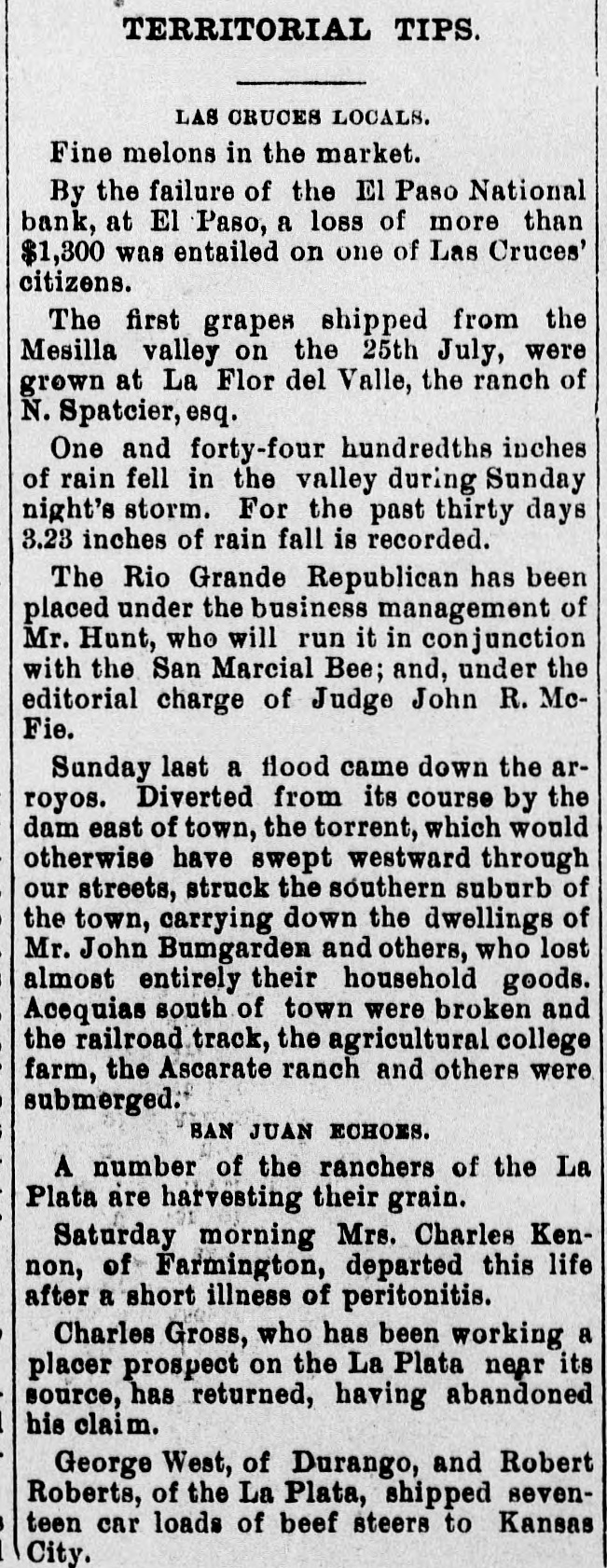 TERRITORIAL TIPS. LAS CRUCES LOCALS. Fine melons in the market. By the failure of the El Paso National bank, at El Paso, a loss of more than $1,300 was entailed on one of Las Cruces' citizens. The first grapes shipped from the Mesilla valley on the 25th July, were grown at La Flor del Valle, the ranch of N. Spatcier, esq. One and forty-four hundredths inches of rain fell in the valley during Sunday night's storm. For the past thirty days 3.23 inches of rain fall is recorded. The Rio Grande Republican has been placed under the business management of Mr. Hunt, who will run it in conjunction with the San Marcial Bee; and, under the editorial charge of Judge John R. McFie. Sunday last a flood came down the arroyos. Diverted from its course by the dam east of town, the torrent, which would otherwise have swept westward through our streets, struck the southern suburb of the town, carrying down the dwellings of Mr. John Bumgarden and others, who lost almost entirely their household goods. Acequias south of town were broken and the railroad track, the agricultural college farm, the Ascarate ranch and others were submerged: BAN JUAN ECHOES. A number of the ranchers of the La Plata are harvesting their grain. Saturday morning Mrs. Charles Kennon, of Farmington, departed this life after a short illness of peritonitis. Charles Gross, who has been working a placer prospect on the La Plata near its source, has returned, having abandoned his claim. George West, of Durango, and Robert Roberts, of the La Plata, shipped seventeen car loads of beef steers to Kansas City.