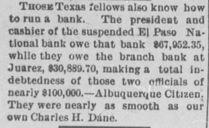 THOSE TEXAS FELLOWS ALSO KNOW HOW TO RUN A BANK The president and cashier of the suspended El Paso National bank owe that bank $67,952.35, while they owe the branch bank at Juarez, $30,889.70, making a total indebtedness of those two officials of nearly $100,000.--Albuquerque Citizen. They were nearly as smooth as our own Charles H. Dane.