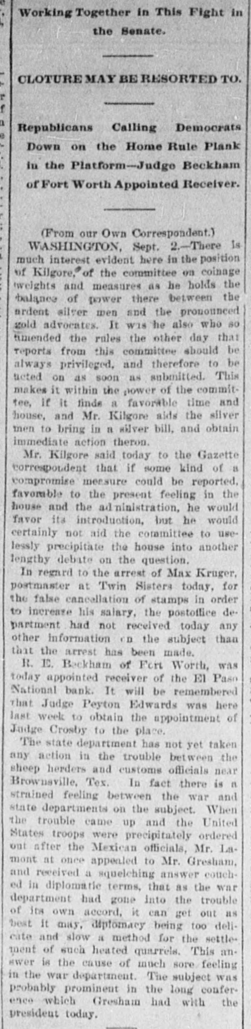 Working Together in This Fight in the Senate. CLOTURE MAY BE RESORTED TO. Republicans Calling Democrats Down on the Home Rule Plank in the Platform-Judge Beckham of Fort Worth Appointed Receiver. (From our Own Correspondent.) WASHINGTON, Sept. 2.-There Is much interest evident here in the position of Kilgore,® of the committee on coinage weights and measures as be holds the balance of power there between the ardent silver men and the pronounced gold advocates. It W18 he also who so timended the rules the other day that reports from this committee should be always privileged, and therefore to be neted on as soon as submitted. This makes it within the power of the committee, If it finds a favorable time and house, and Mr. Kilgore aids the silver men to bring in a silver bill, and obtain immediate action theron. Mr. Kilgore said today to the Gazette correspondent that if some kind of a compromise measure could be reported, favorable to the present feeling in the house and the ad Ininistration, he would favor its introduction, but he would certainly not aid the committee to uselessly precipitate the house into another lengthy debate on the question. In regard to the arrest of Max Kruger, postmaster at Twin Sisters today, for the false cancellation of stamps in order to increase his salary, the postoffice department had not received today any other information on the subject than that the arrest has been made. R. ID. Backham of Fort Worth, was today appointed receiver of the El Paso National bank. It will be remembered that Judge Peyton Edwards was here last week to obtain the appointment of Judge Crosby to the place. The state department has not yet taken any action in the trouble between the sheep herders and customs officials near Brownsville, Tex. In fact there is n strained feeling between the war and state departments on the subject. When the trouble came up and the United States troops were precipitately ordered out after the Mexican officials, Mr. Lamont at once appealed to Mr. Gresham. and received a squelching answer couched in diplomatic terms, that as the war department had gone into the trouble of its own accord, it can get out as best It may, diptomacy being too delicate and slow a method for the settlement of such heated quarrels. This answer is the cause of much sore feeling in the war department. The subject was probably prominent in the long conferenco which Gresham had with the president today.