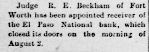 Judge R. E. Beckham of Fort Worth has been appointed receiver of the El Paso National bank, which closed its doors on the morning of August 2.