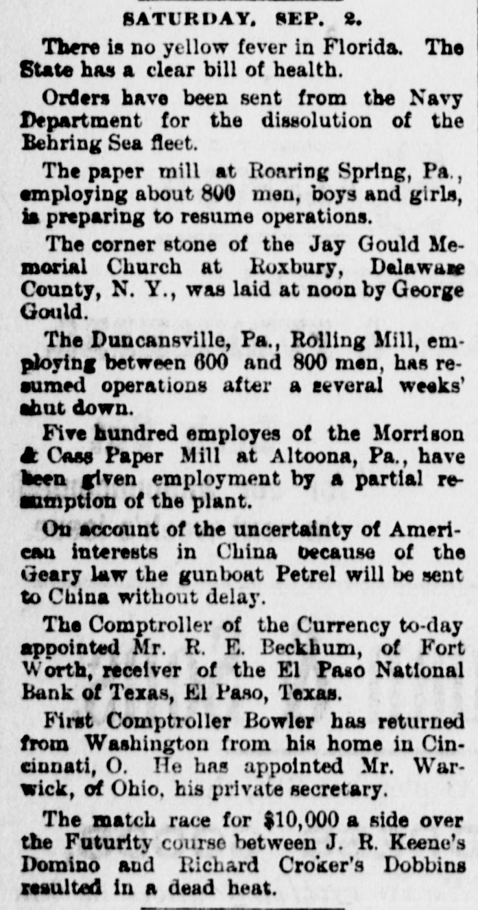 SATURDAY, SEP. 2. There is no yellow fever in Florida. The State has a clear bill of health. Orders have been sent from the Navy Department for the dissolution of the Behring Sea fleet. The paper mill at Roaring Spring, Pa., employing about 800 men, boys and girls, is preparing to resume operations. The corner stone of the Jay Gould Memorial Church at Roxbury, Delaware County, N. Y., was laid at noon by George Gould. The Duncansville, Pa., Rolling Mill, employing between 600 and 800 men, has resumed operations after a several weeks' shut down. Five hundred employes of the Morrison & Cass Paper Mill at Altoona, Pa., have been given employment by a partial resumption of the plant. On account of the uncertainty of American interests in China because of the Geary law the gunboat Petrel will be sent to China without delay. The Comptroller of the Currency to-day appointed Mr. R. E. Beckhum, of Fort Worth, receiver of the El Paso National Bank of Texas, El Paso, Texas. First Comptroller Bowler has returned from Washington from his home in Cincinnati, O. He has appointed Mr. Warwick, of Ohio, his private secretary. The match race for $10,000 a side over the Futurity course between J. R. Keene's Domino and Richard Croker's Dobbins resulted in a dead heat.