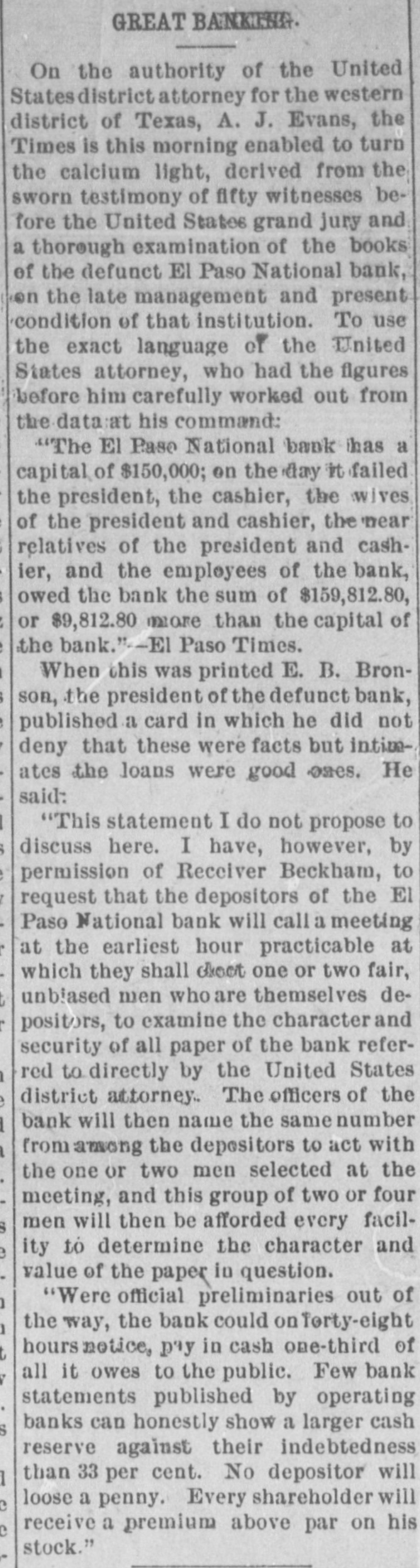 GREAT BANKETT. On the authority of the United States district attorney for the western district of Texas, A. J. Evans, the Times is this morning enabled to turn the calcium light, derived from the sworn testimony of fifty witnesses before the United States grand jury and a thorough examination of the books of the defunct El Paso National bank, on the late management and present condition of that institution. To use the exact language of the United States attorney, who had the figures before him carefully worked out from the data at his command: "The El Pase National bank ihas a capital of $150,000; on the day it failed the president, the cashier, the wives of the president and cashier, the near relatives of the president and cashier, and the employees of the bank, owed the bank the sum of $159,812.80, or $9,812.80 more than the capital of the bank." - El Paso Times. When this was printed E. B. Bronson, the president of the defunct bank, published a card in which he did not deny that these were facts but intimates the loans were good ones. He said: "This statement I do not propose to discuss here. I have, however, by permission of Receiver Beckham, to request that the depositors of the El Paso National bank will call a meeting at the earliest hour practicable at which they shall doct one or two fair, unblased men who are themselves depositors, to examine the character and security of all paper of the bank referred to directly by the United States district attorney.. The officers of the bank will then name the same number from among the depositors to act with the one or two men selected at the meeting, and this group of two or four men will then be afforded every facility to determine the character and value of the paper in question. "Were official preliminaries out of the way, the bank could on Torty-eight hours notice, pay in cash one-third of all it owes to the public. Few bank statements published by operating banks can honestly show a larger cash reserve against their indebtedness than 33 per cent. No depositor will loose a penny. Every shareholder will receive a premium above par on his stock."