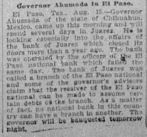 # Governor Ahumada in El Paso, El Paso, Tex., Aug. 15.-Governor Alhumada of the state of Chihuahua, Mexico, came up this morning and will spend several days in Juarez. He is looking especially into the affairs of the bank of Juares which closed its doors more than a year ago. The bank was operated by the officers of the El Paso national bank which failed the same day. The bank of Juarez was called a branch of the El Paso national and some of the governor's advisors claim that the receiver of the El Paso national can be made to assume certain debts of the branch. As a matter of fact, no national bank in this country can have a branch in another. The governor will be banqueted tomorrow night.