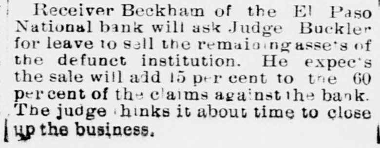 Receiver Beckham of the El Paso National bank will ask Judge Buckler for leave to sell the remaining assets of the defunct institution. He expec's the sale will add 15 per cent to the 60 percent of the claims against the bank. The judge hinks it about time to close UP the business.